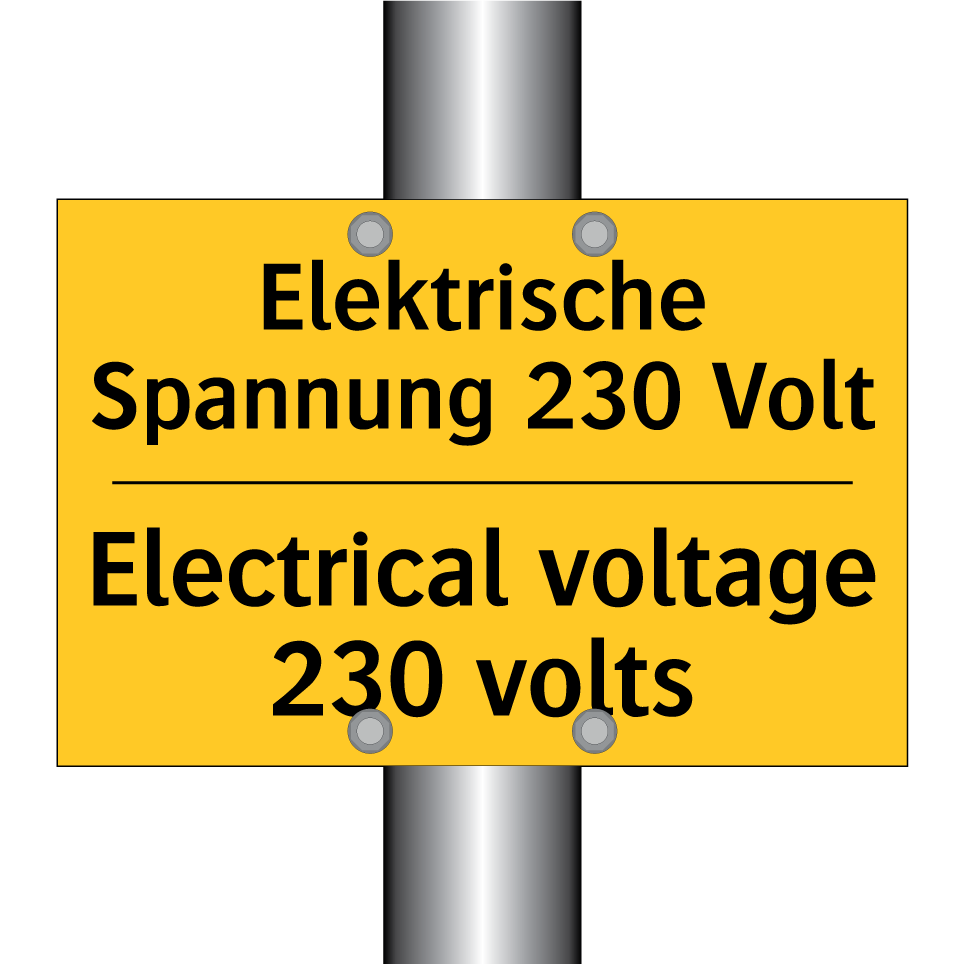 Zweisprachiges Warnschild mit deutschem Text Elektrische Spannung 230 Volt und englischem Text Electrical voltage 230 volts