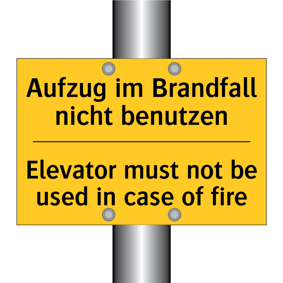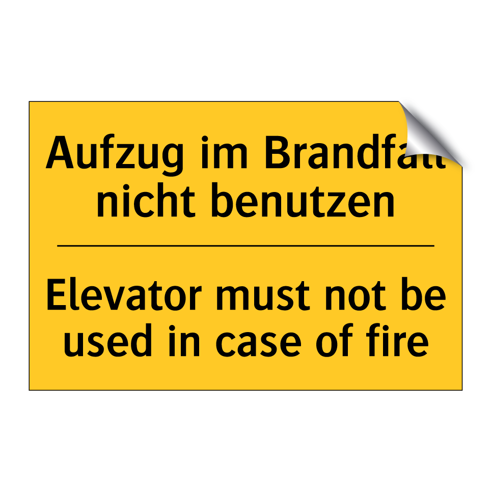 Zweisprachiges Warnschild mit deutschem Text Aufzug im Brandfall nicht benutzen und englischem Text Elevator must not be used in case of fire