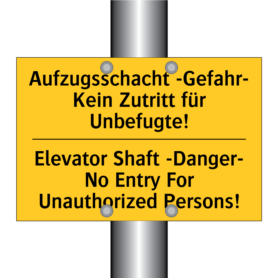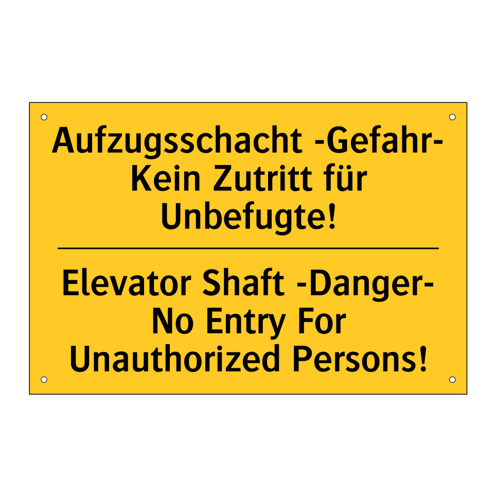 Zweisprachiges Warnschild mit deutschem Text Aufzugsschacht -Gefahr- Kein Zutritt für Unbefugte! und englischem Text Elevator Shaft -Danger- No Entry For Unauthorized Persons!
