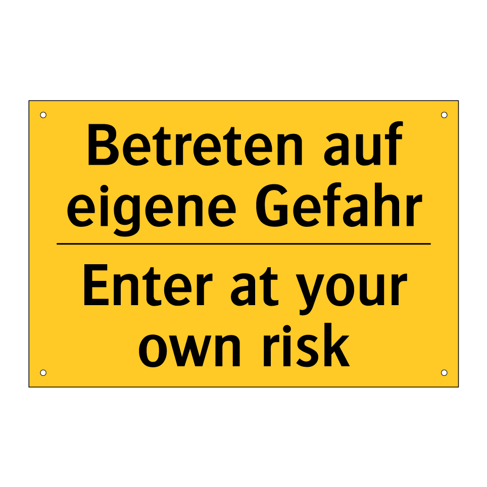 Zweisprachiges Warnschild mit deutschem Text Betreten auf eigene Gefahr und englischem Text Enter at your own risk