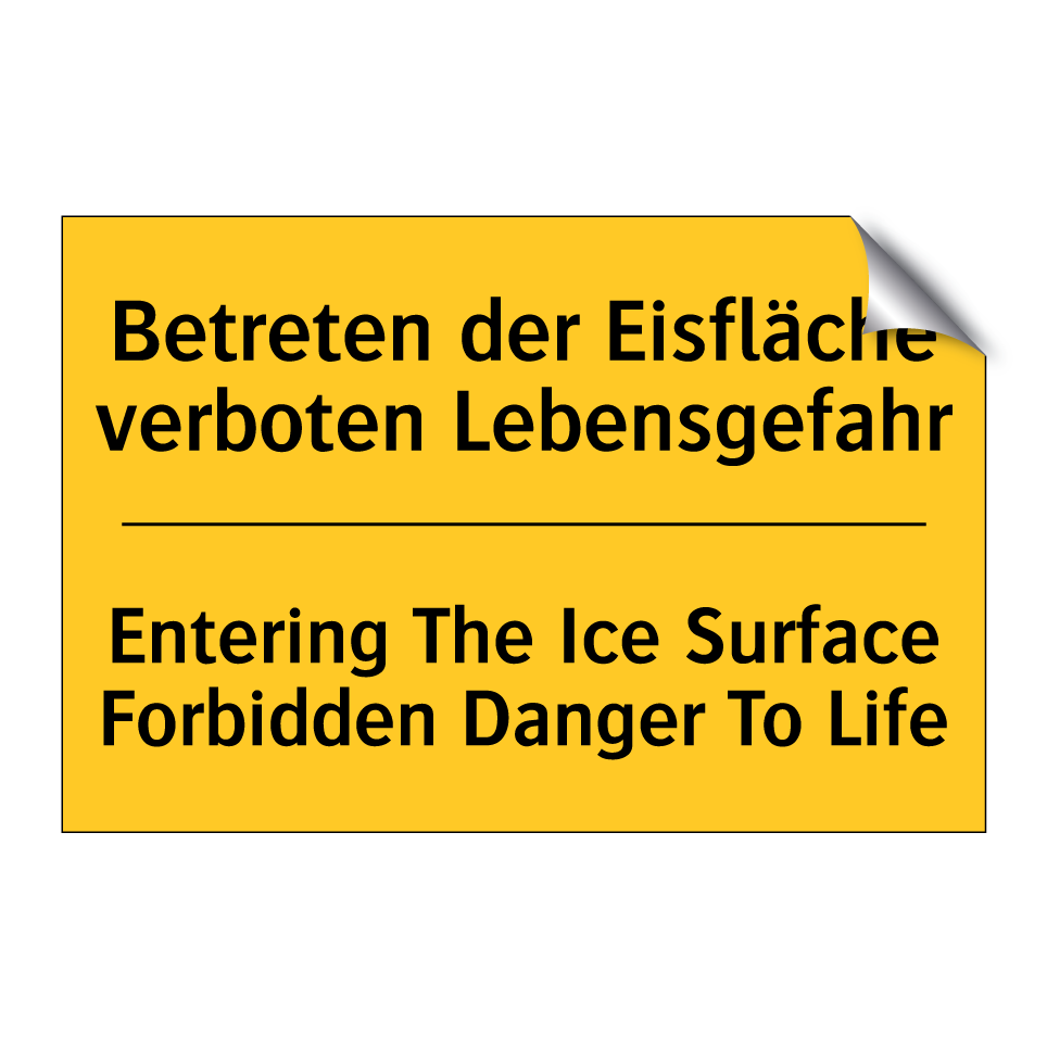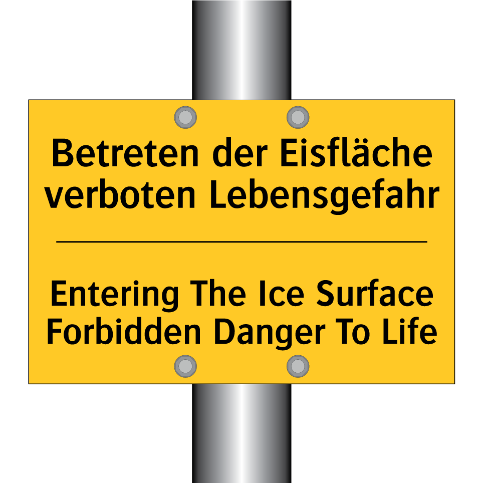 Zweisprachiges Warnschild mit deutschem Text Betreten der Eisfläche verboten Lebensgefahr und englischem Text Entering The Ice Surface Forbidden Danger To Life