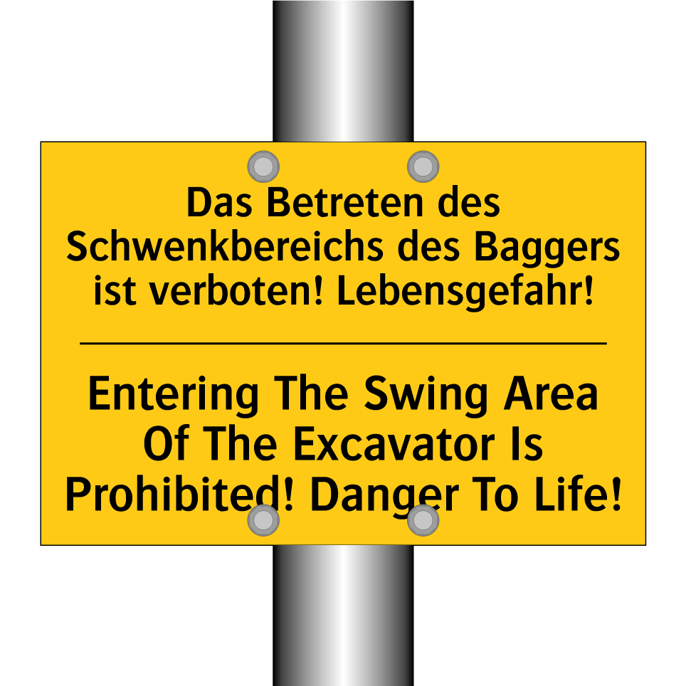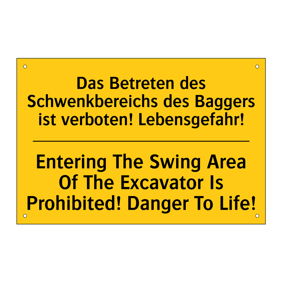 Zweisprachiges Warnschild mit deutschem Text Das Betreten des Schwenkbereichs des Baggers ist verboten! Lebensgefahr! und englischem Text Entering The Swing Area Of The Excavator Is Prohibited! Danger To Life!