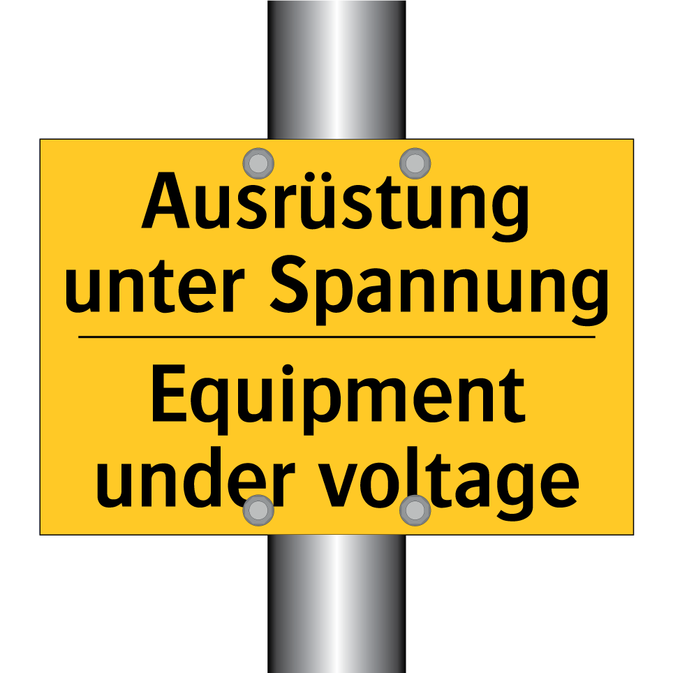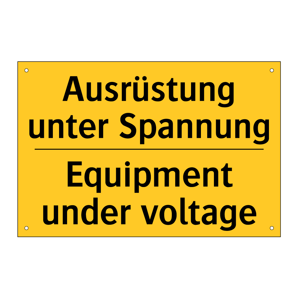 Zweisprachiges Warnschild mit deutschem Text Ausrüstung unter Spannung und englischem Text Equipment under voltage