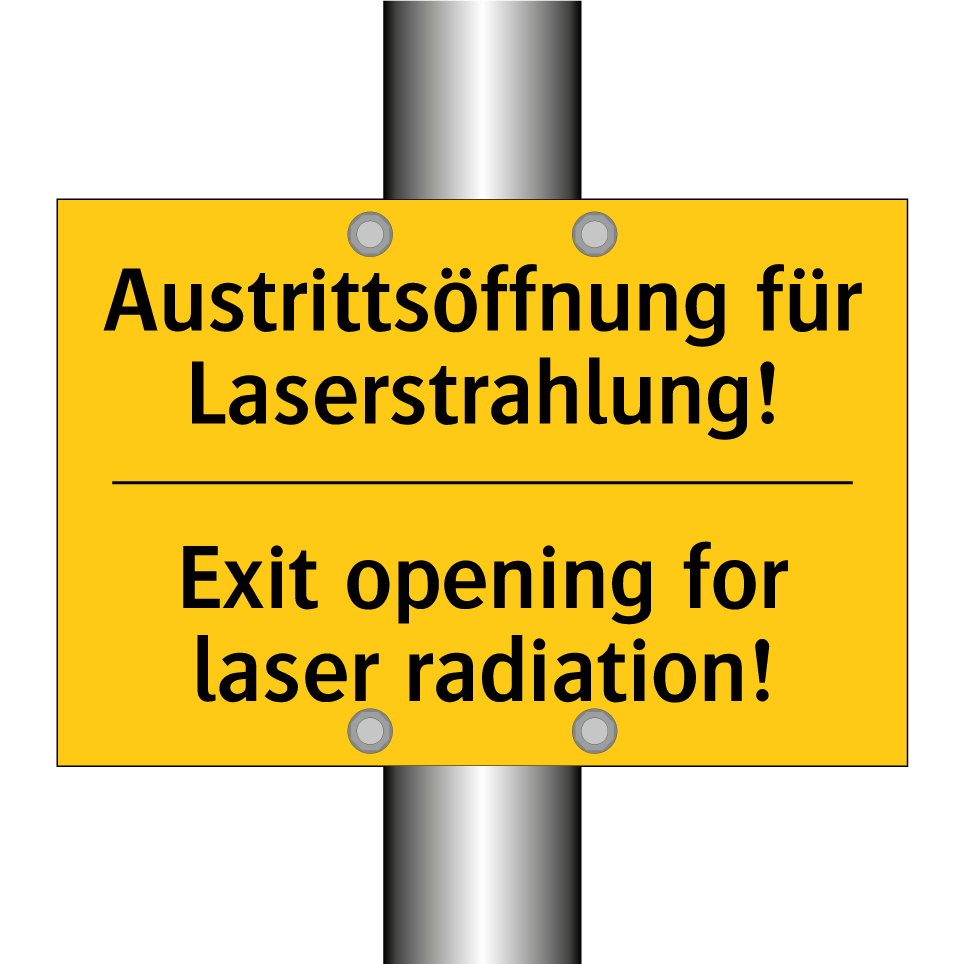 Zweisprachiges Warnschild mit deutschem Text Austrittsöffnung für Laserstrahlung! und englischem Text Exit opening for laser radiation!