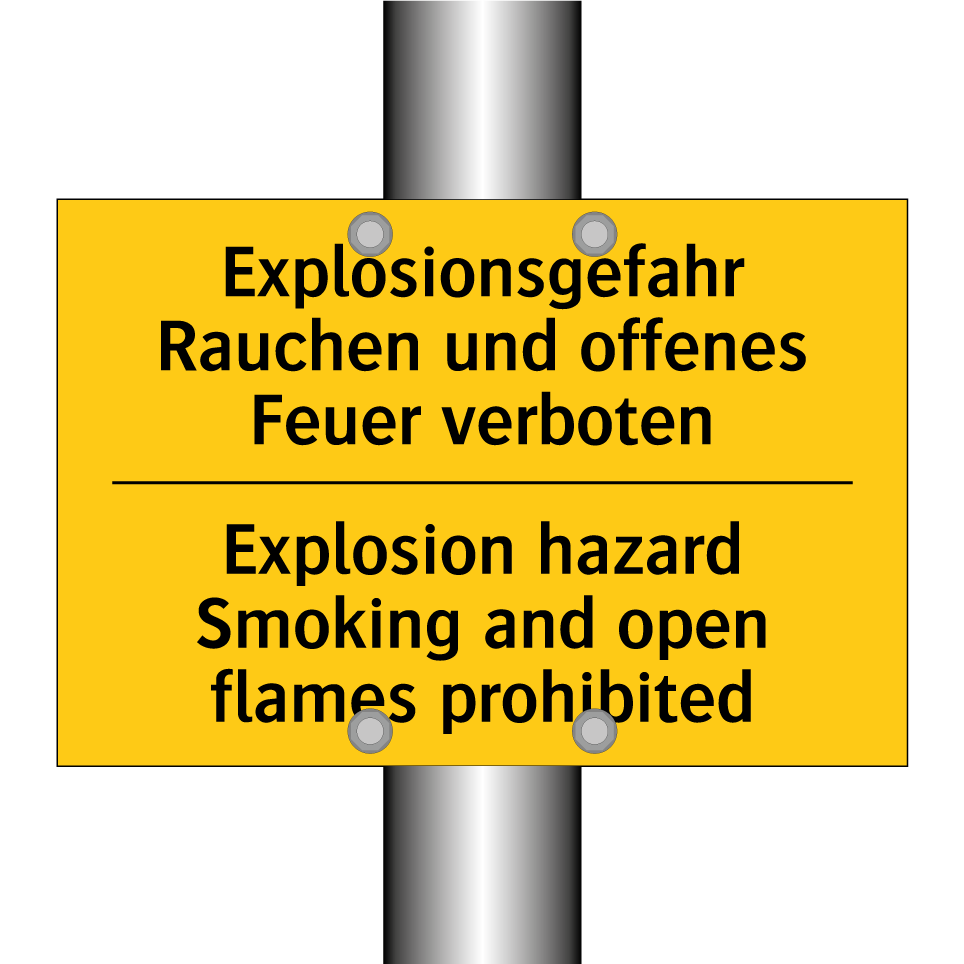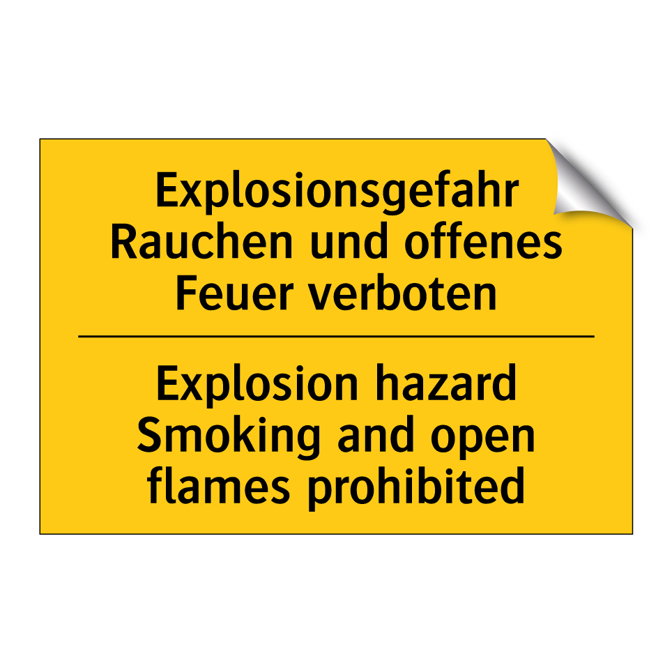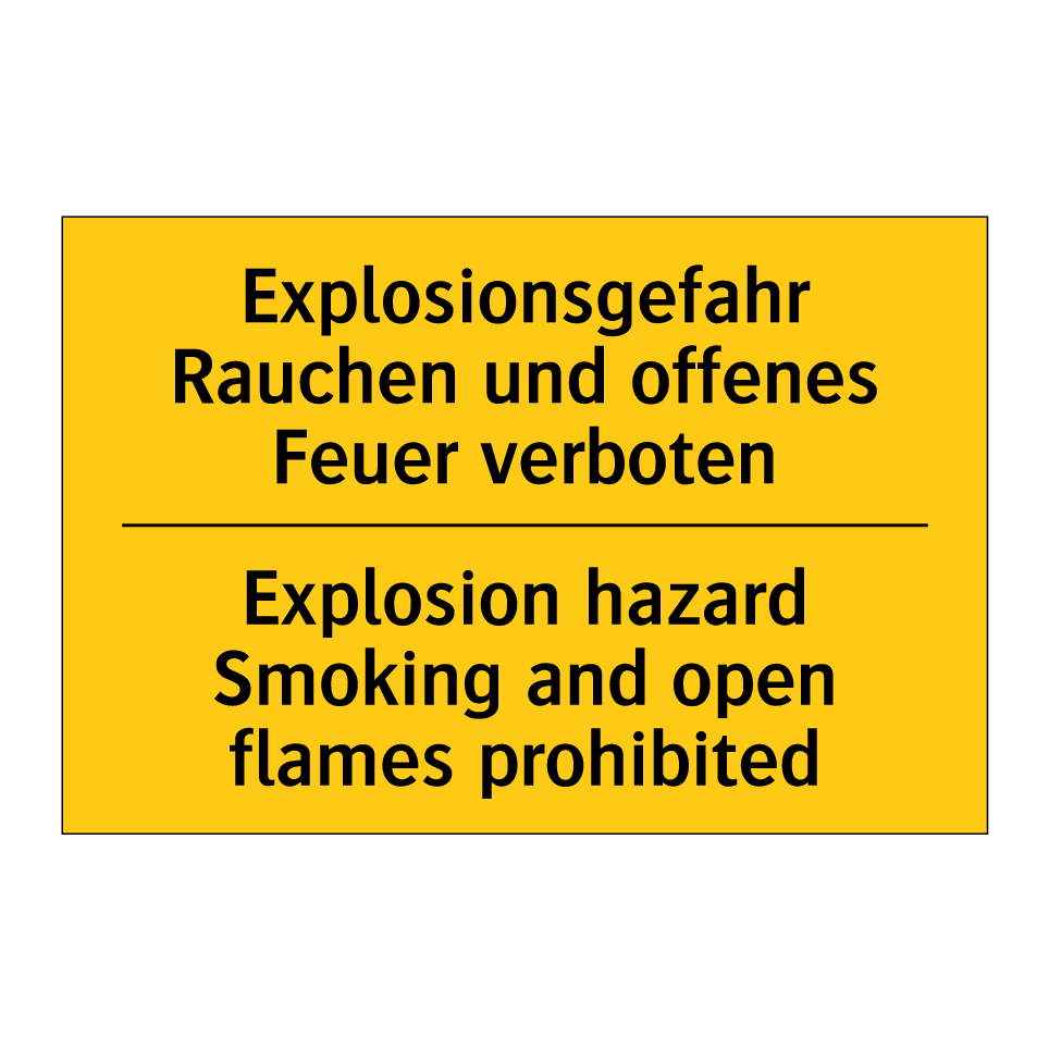 Zweisprachiges Warnschild mit deutschem Text Explosionsgefahr Rauchen und offenes Feuer verboten und englischem Text Explosion hazard Smoking and open flames prohibited