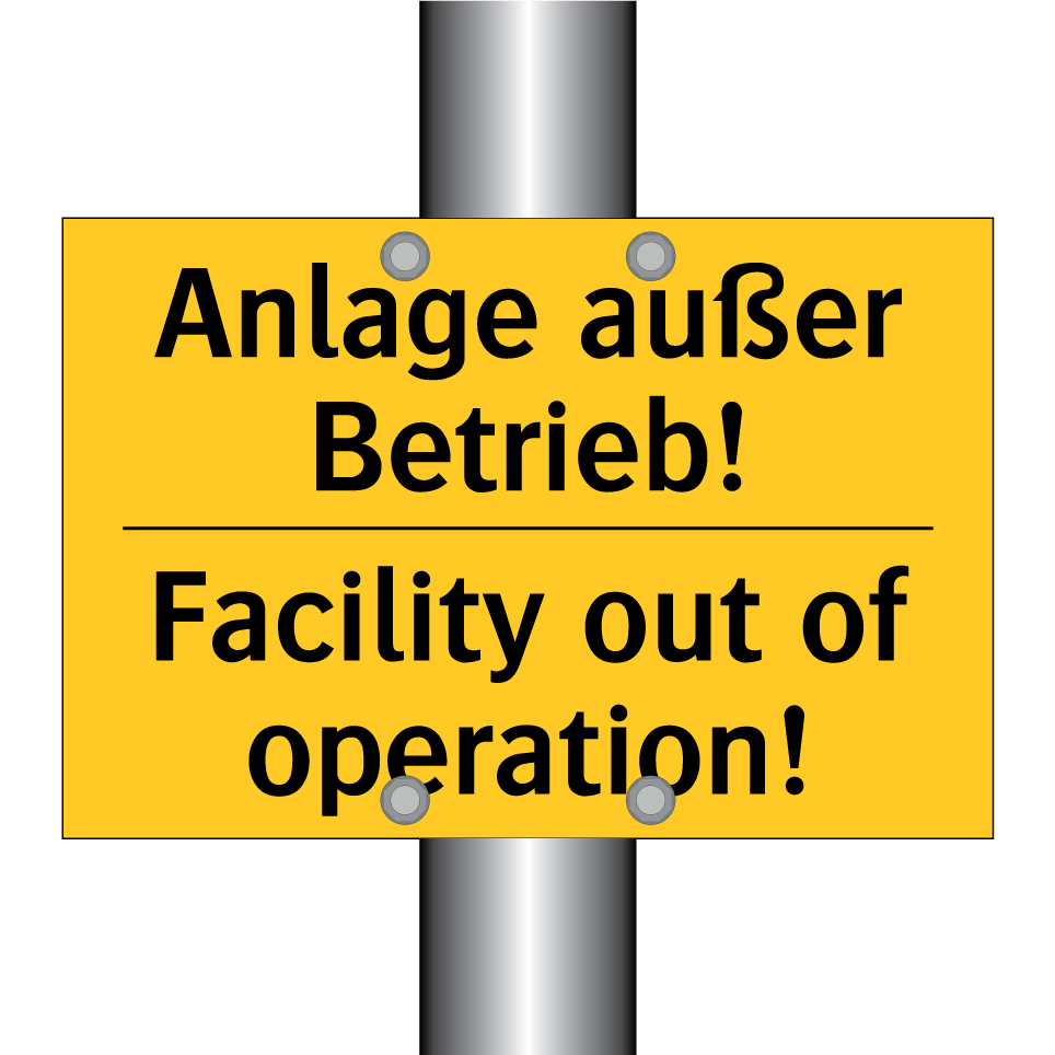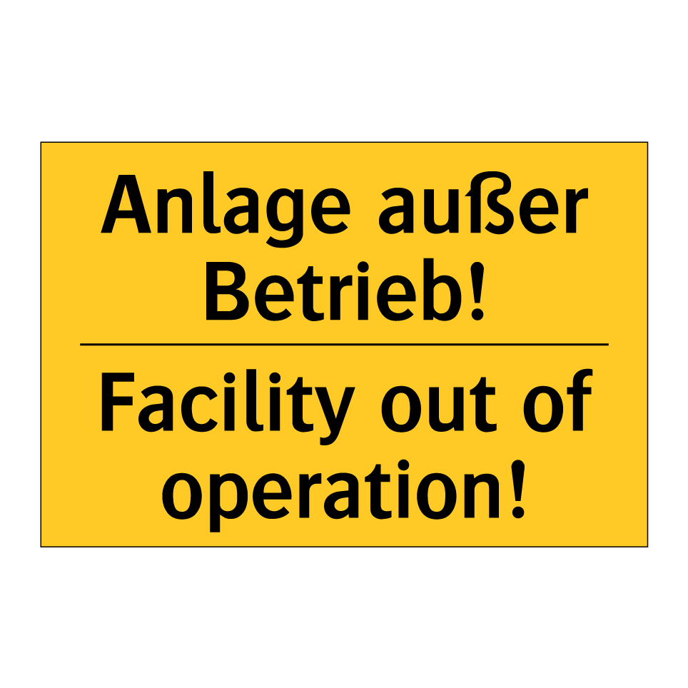 Zweisprachiges Warnschild mit deutschem Text Anlage außer Betrieb! und englischem Text Facility out of operation!