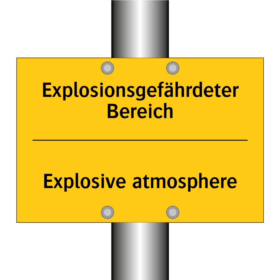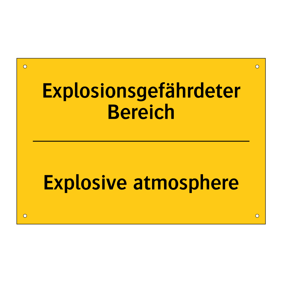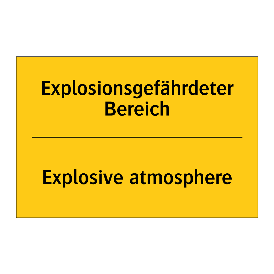 Zweisprachiges Warnschild mit deutschem Text Explosionsgefährdeter Bereich und englischem Text Explosive atmosphere