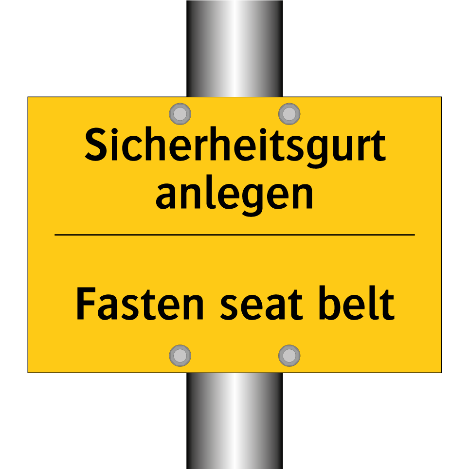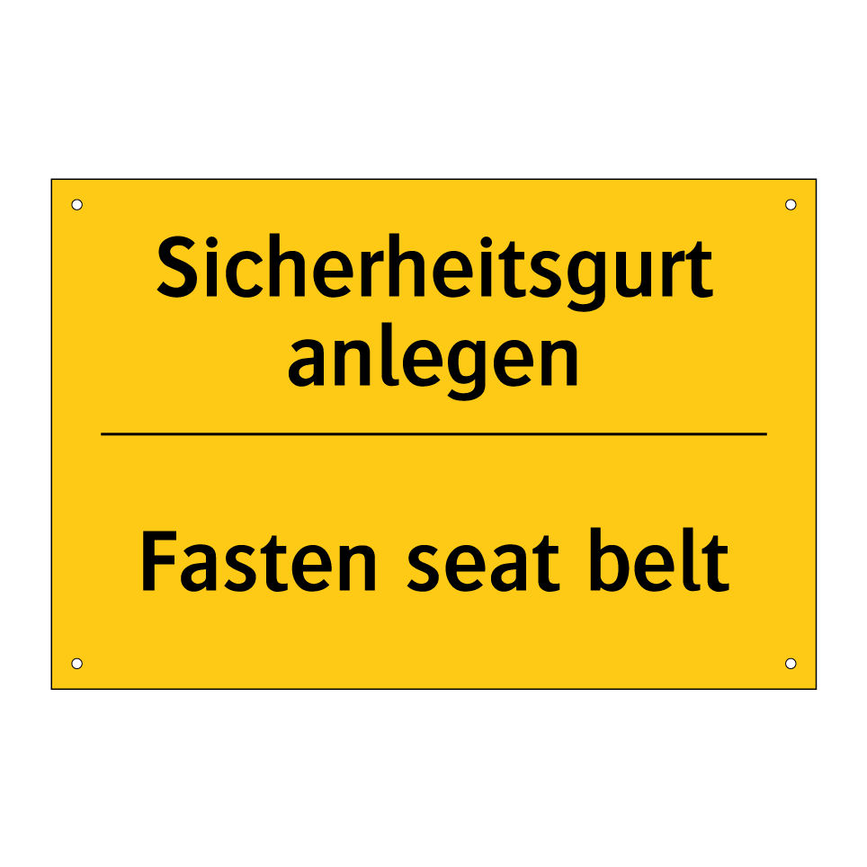Zweisprachiges Warnschild mit deutschem Text Sicherheitsgurt anlegen und englischem Text Fasten seat belt