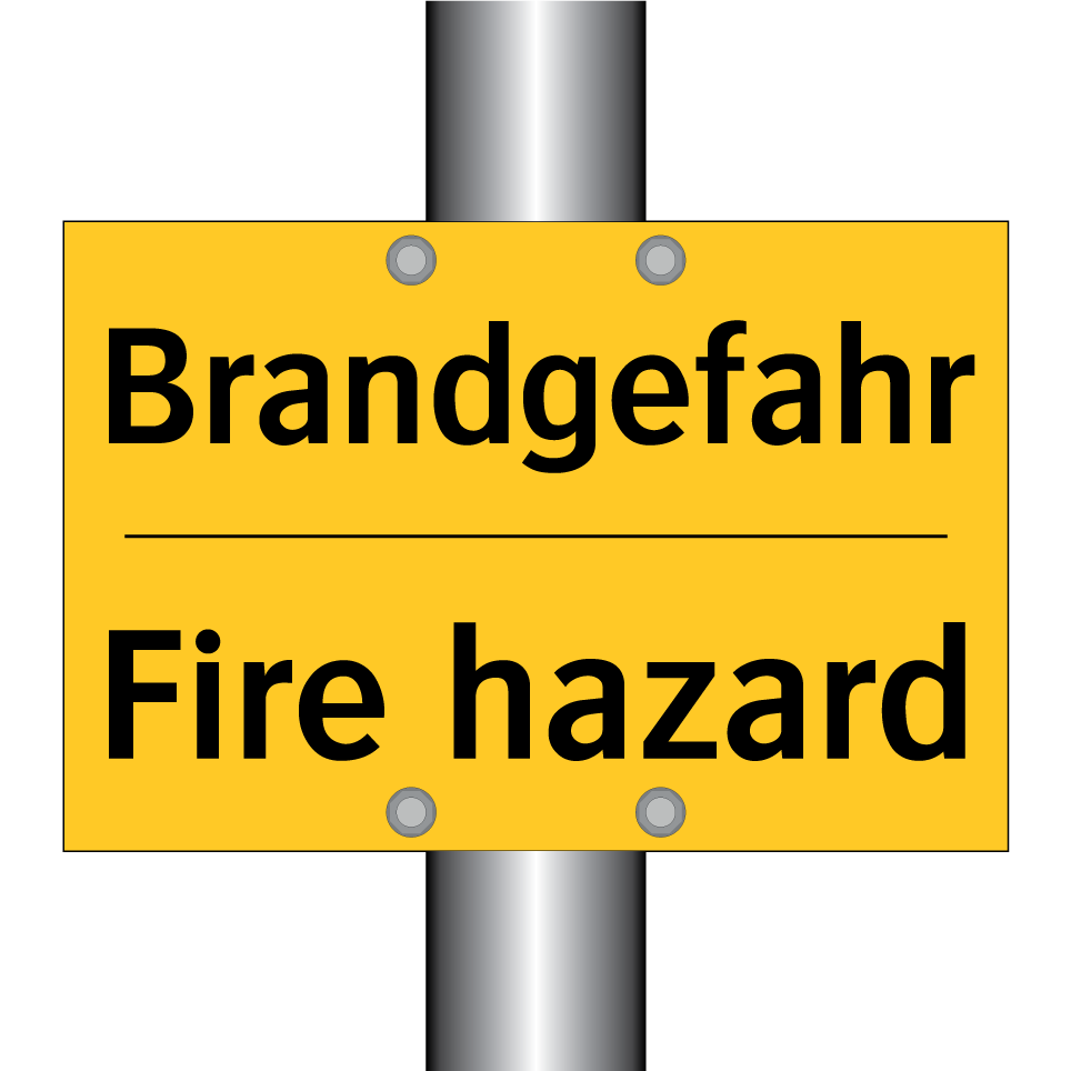 Zweisprachiges Warnschild mit deutschem Text Brandgefahr und englischem Text Fire hazard