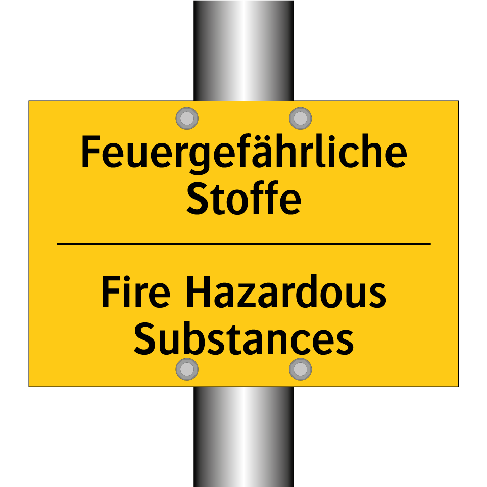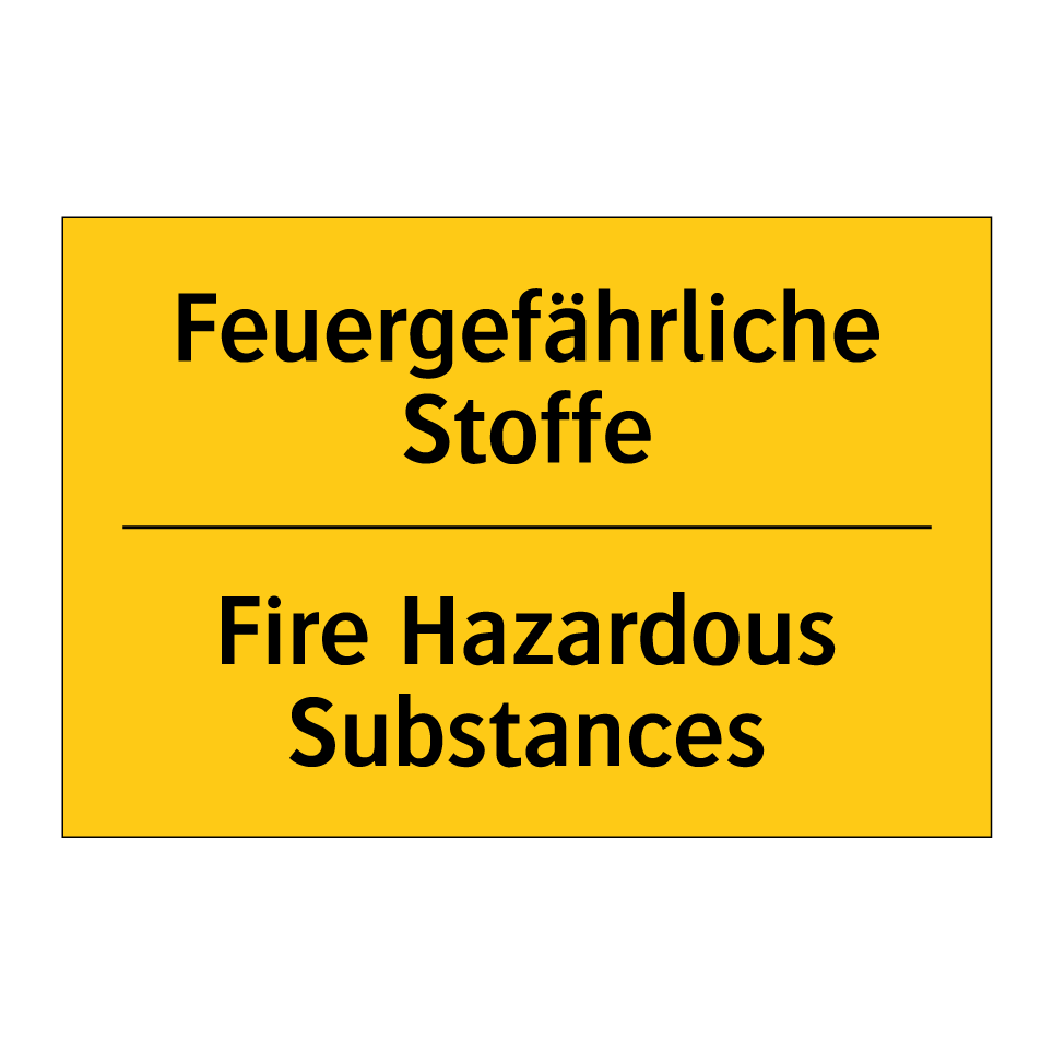 Zweisprachiges Warnschild mit deutschem Text Feuergefährliche Stoffe und englischem Text Fire Hazardous Substances