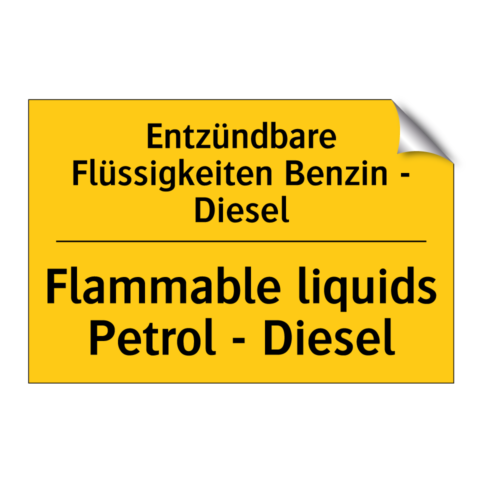 Zweisprachiges Warnschild mit deutschem Text Entzündbare Flüssigkeiten Benzin - Diesel und englischem Text Flammable liquids Petrol - Diesel