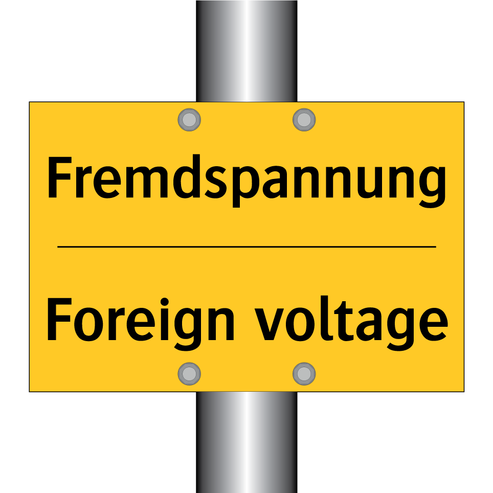Zweisprachiges Warnschild mit deutschem Text Fremdspannung und englischem Text Foreign voltage