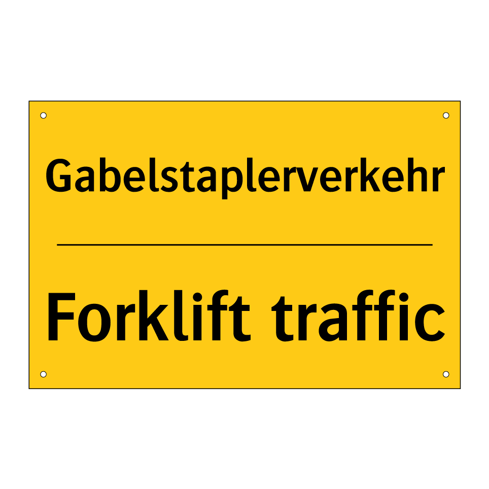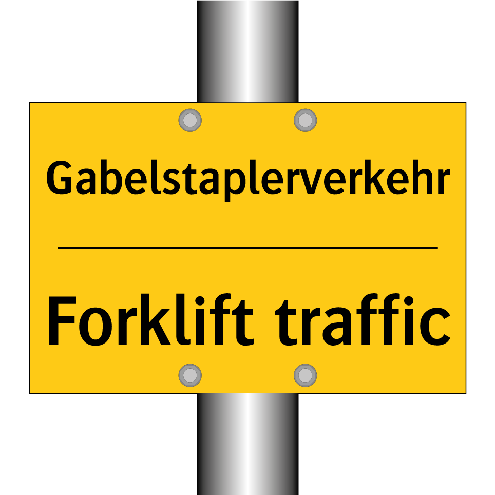 Zweisprachiges Warnschild mit deutschem Text Gabelstaplerverkehr und englischem Text Forklift traffic