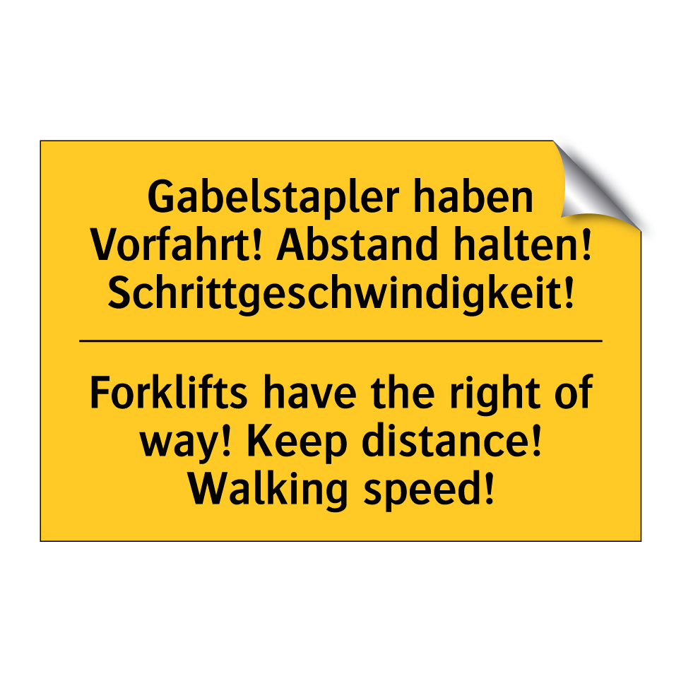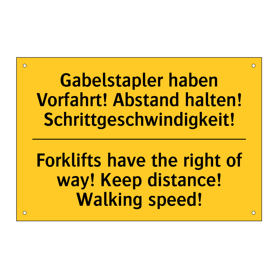 Zweisprachiges Warnschild mit deutschem Text Gabelstapler haben Vorfahrt! Abstand halten! Schrittgeschwindigkeit! und englischem Text Forklifts have the right of way! Keep distance! Walking speed!
