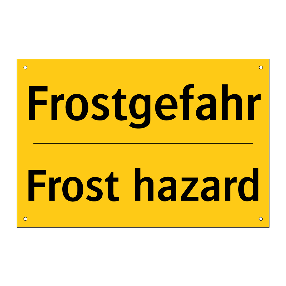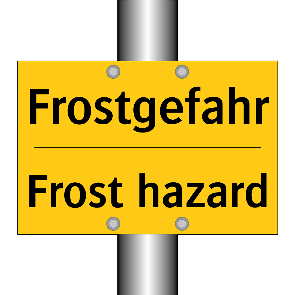 Zweisprachiges Warnschild mit deutschem Text Frostgefahr und englischem Text Frost hazard