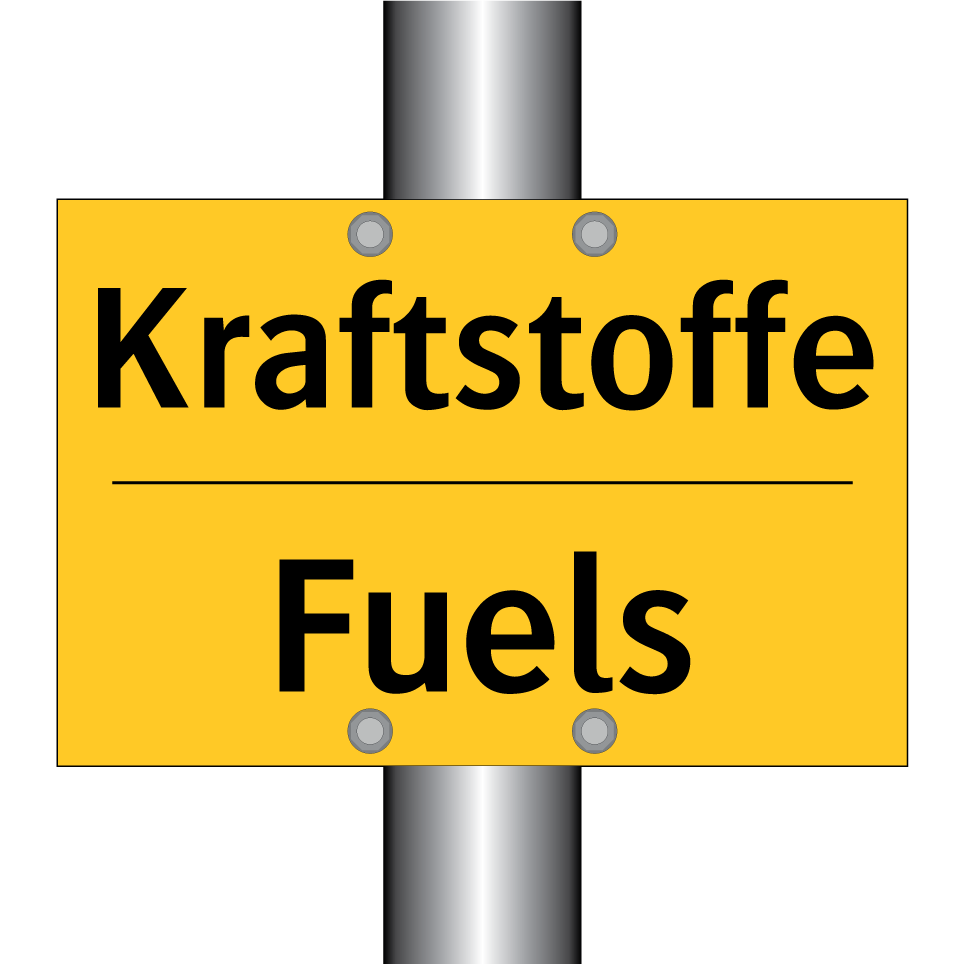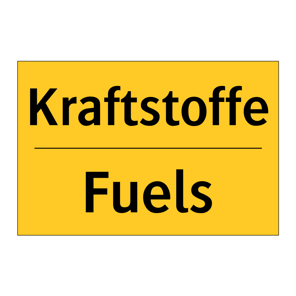 Zweisprachiges Warnschild mit deutschem Text Kraftstoffe und englischem Text Fuels