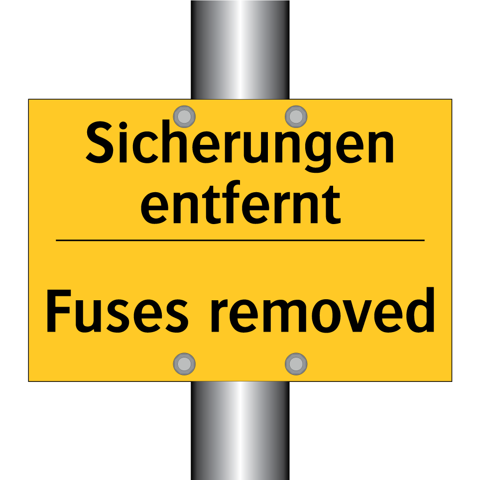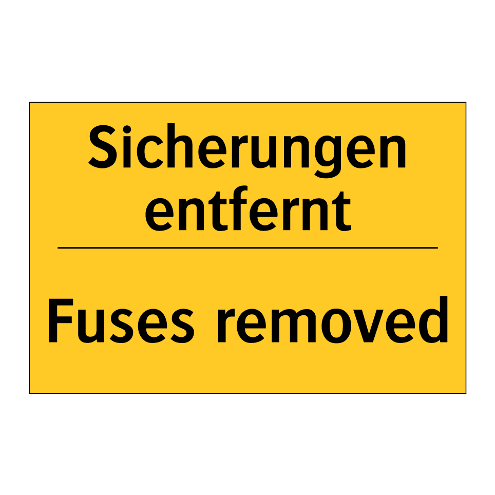 Zweisprachiges Warnschild mit deutschem Text Sicherungen entfernt und englischem Text Fuses removed