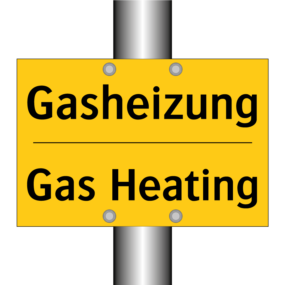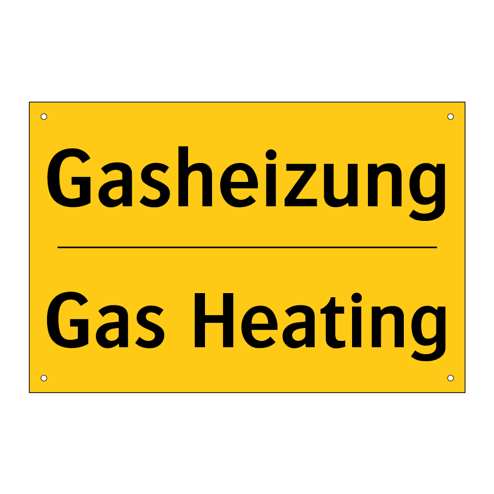 Zweisprachiges Warnschild mit deutschem Text Gasheizung und englischem Text Gas Heating
