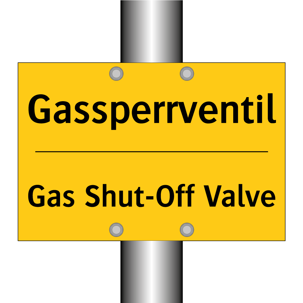 Zweisprachiges Warnschild mit deutschem Text Gassperrventil und englischem Text Gas Shut-Off Valve