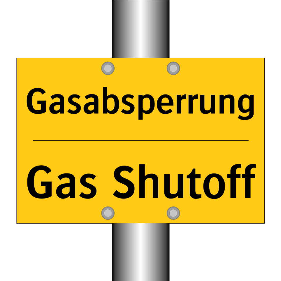 Zweisprachiges Warnschild mit deutschem Text Gasabsperrung und englischem Text Gas Shutoff