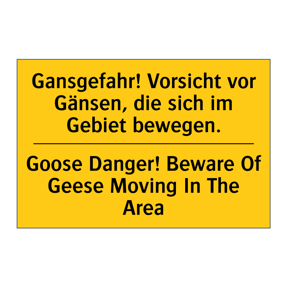 Zweisprachiges Warnschild mit deutschem Text Gansgefahr! Vorsicht vor Gänsen, die sich im Gebiet bewegen. und englischem Text Goose Danger! Beware Of Geese Moving In The Area