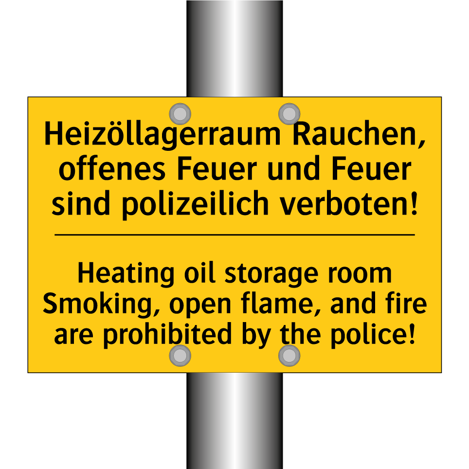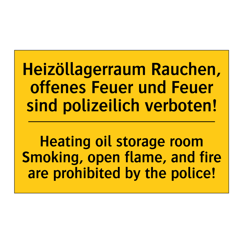 Zweisprachiges Warnschild mit deutschem Text Heizöllagerraum Rauchen, offenes Feuer und Feuer sind polizeilich verboten! und englischem Text Heating oil storage room Smoking, open flame, and fire are prohibited by the police!