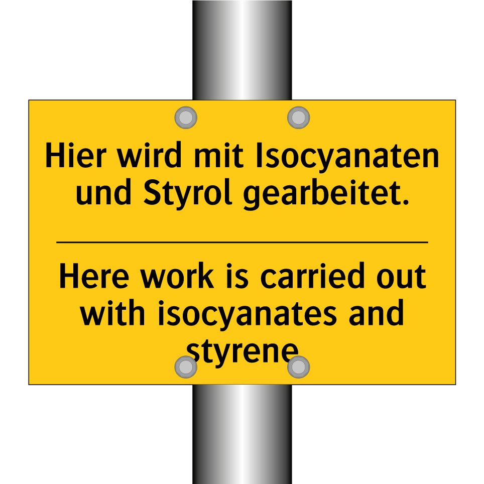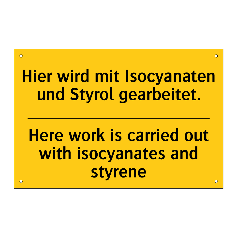 Zweisprachiges Warnschild mit deutschem Text Hier wird mit Isocyanaten und Styrol gearbeitet. und englischem Text Here work is carried out with isocyanates and styrene