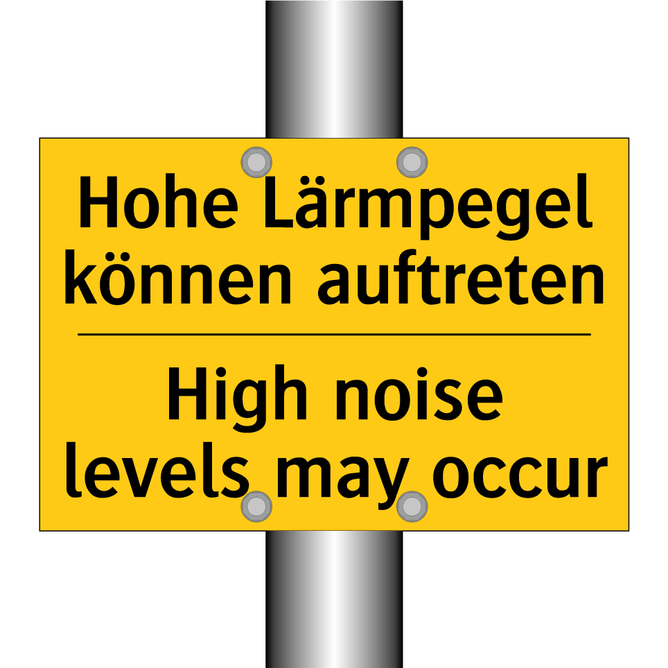 Zweisprachiges Warnschild mit deutschem Text Hohe Lärmpegel können auftreten und englischem Text High noise levels may occur