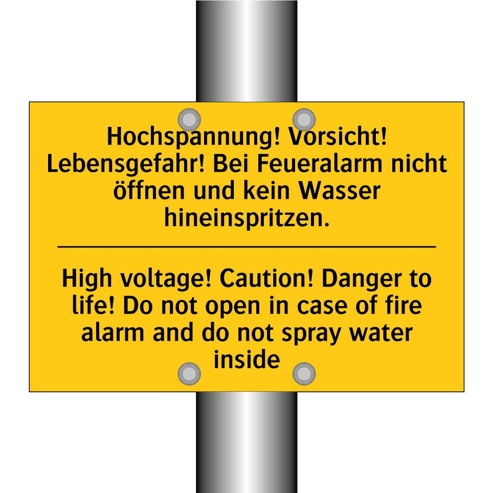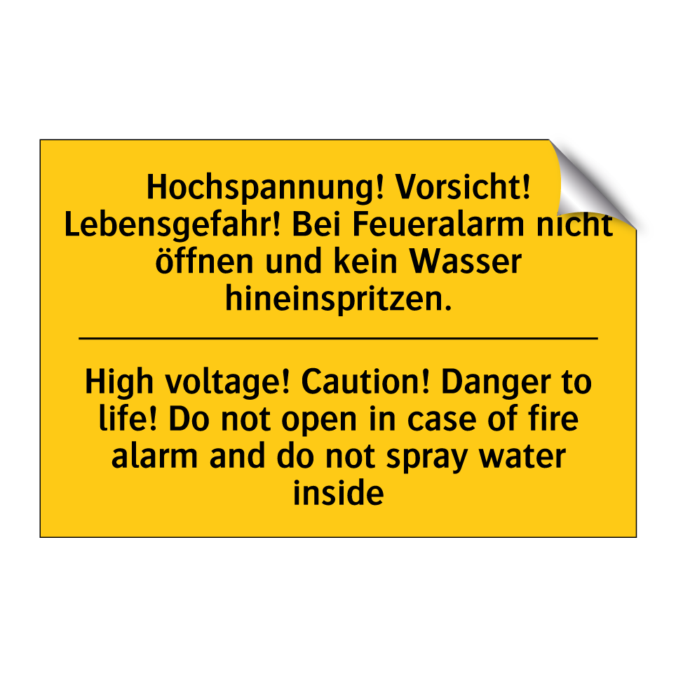 Zweisprachiges Warnschild mit deutschem Text Hochspannung! Vorsicht! Lebensgefahr! Bei Feueralarm nicht öffnen und kein Wasser hineinspritzen. und englischem Text High voltage! Caution! Danger to life! Do not open in case of fire alarm and do not spray water inside