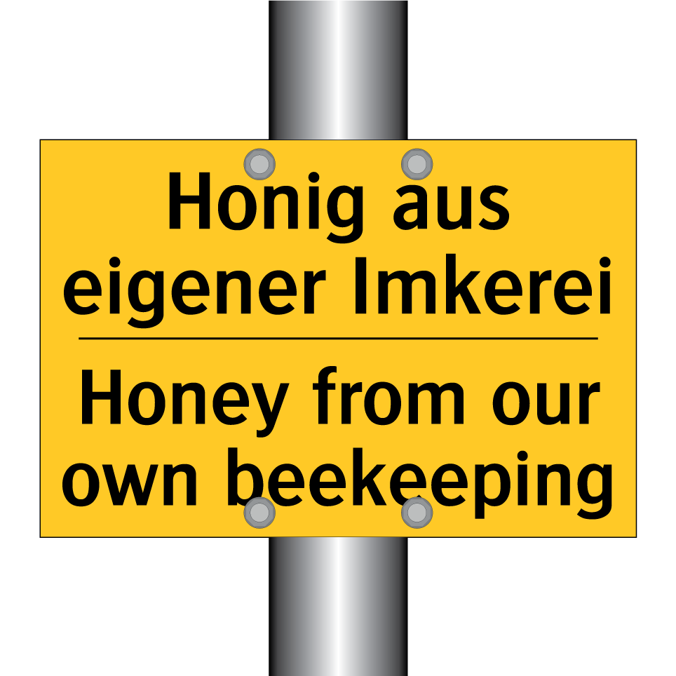 Zweisprachiges Warnschild mit deutschem Text Honig aus eigener Imkerei und englischem Text Honey from our own beekeeping