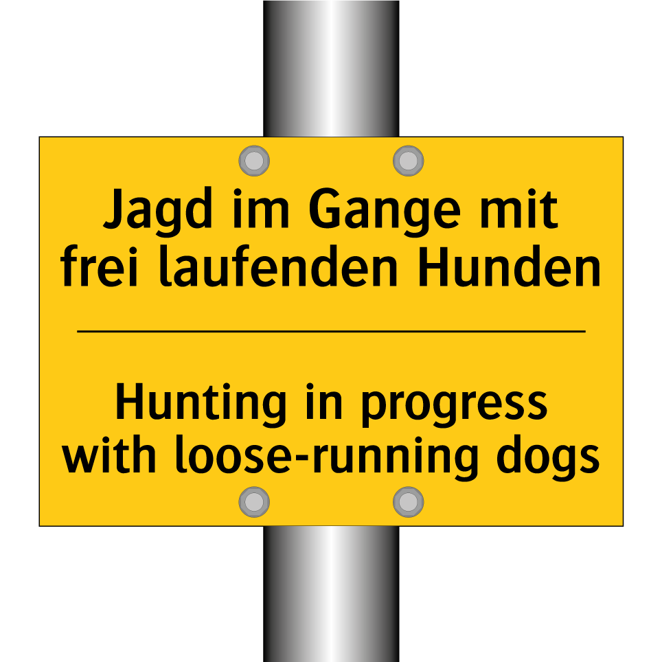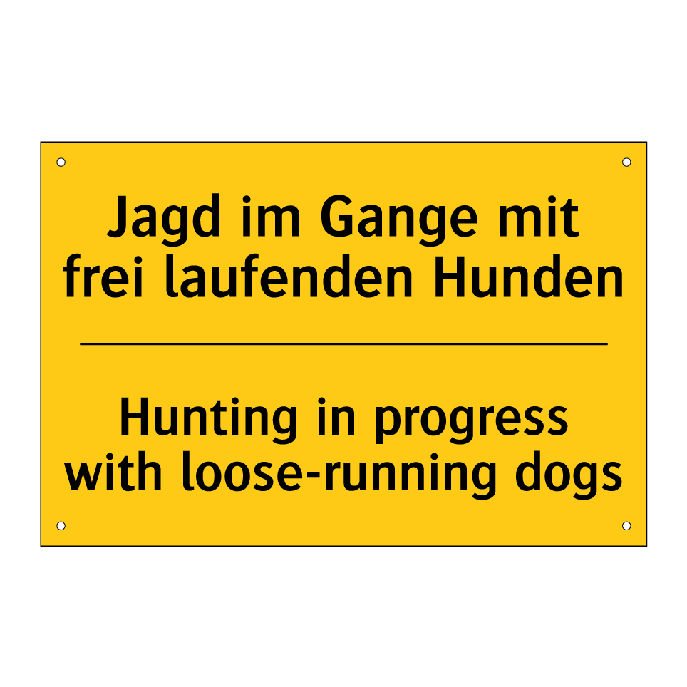 Zweisprachiges Warnschild mit deutschem Text Jagd im Gange mit frei laufenden Hunden und englischem Text Hunting in progress with loose-running dogs