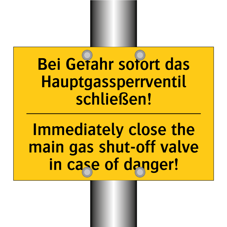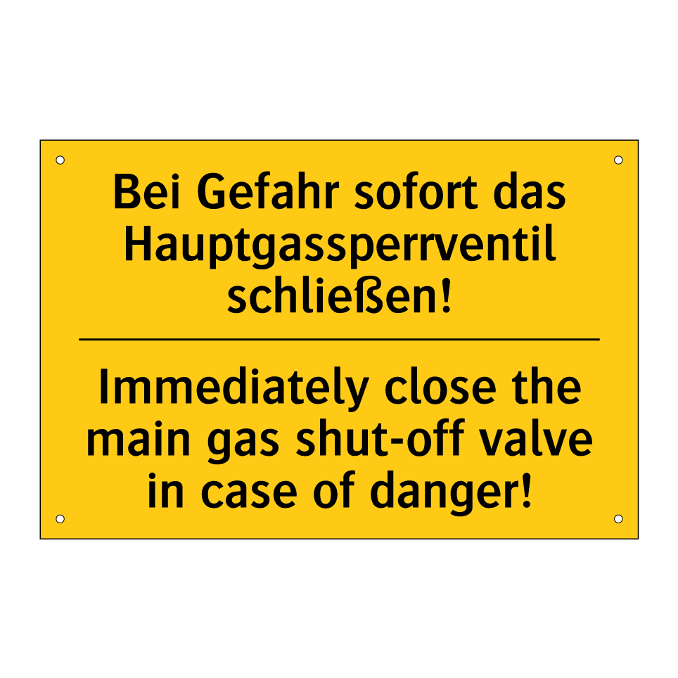 Zweisprachiges Warnschild mit deutschem Text Bei Gefahr sofort das Hauptgassperrventil schließen! und englischem Text Immediately close the main gas shut-off valve in case of danger!