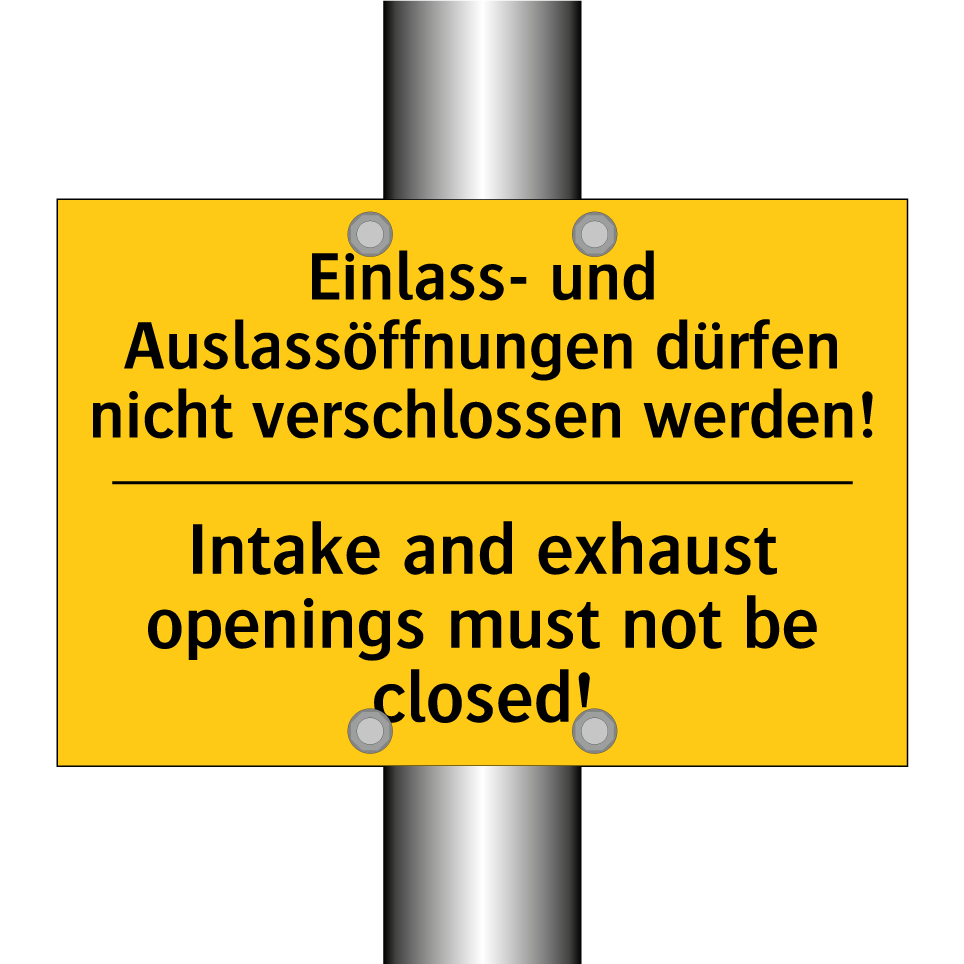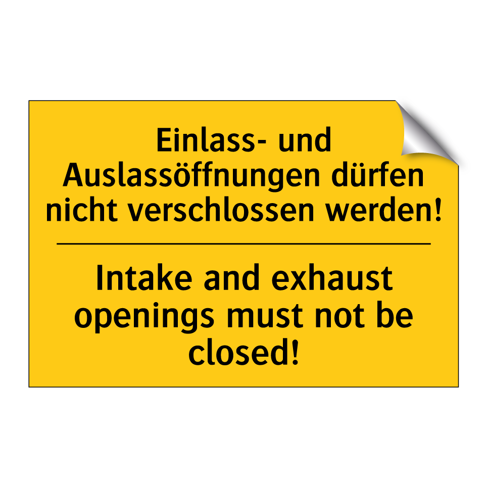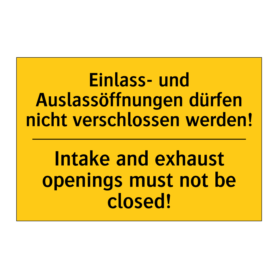 Zweisprachiges Warnschild mit deutschem Text Einlass- und Auslassöffnungen dürfen nicht verschlossen werden! und englischem Text Intake and exhaust openings must not be closed!