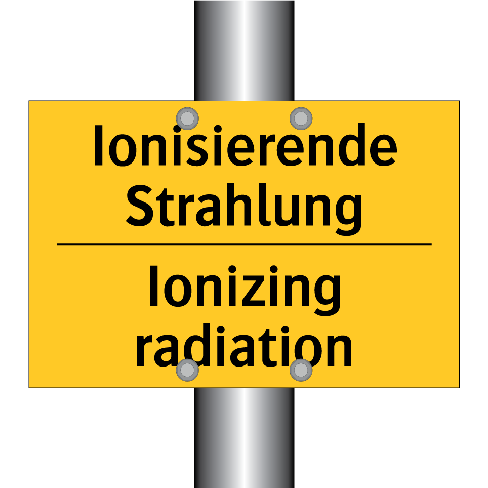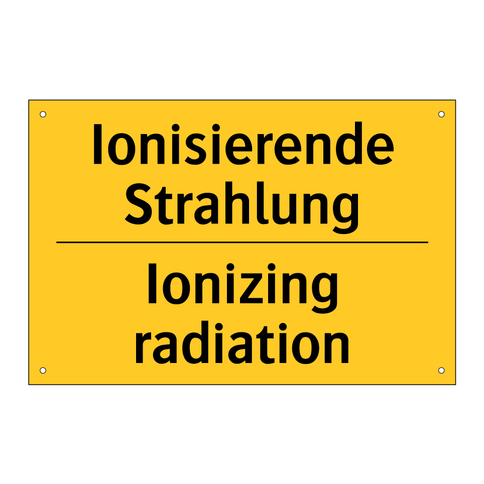 Zweisprachiges Warnschild mit deutschem Text Ionisierende Strahlung und englischem Text Ionizing radiation