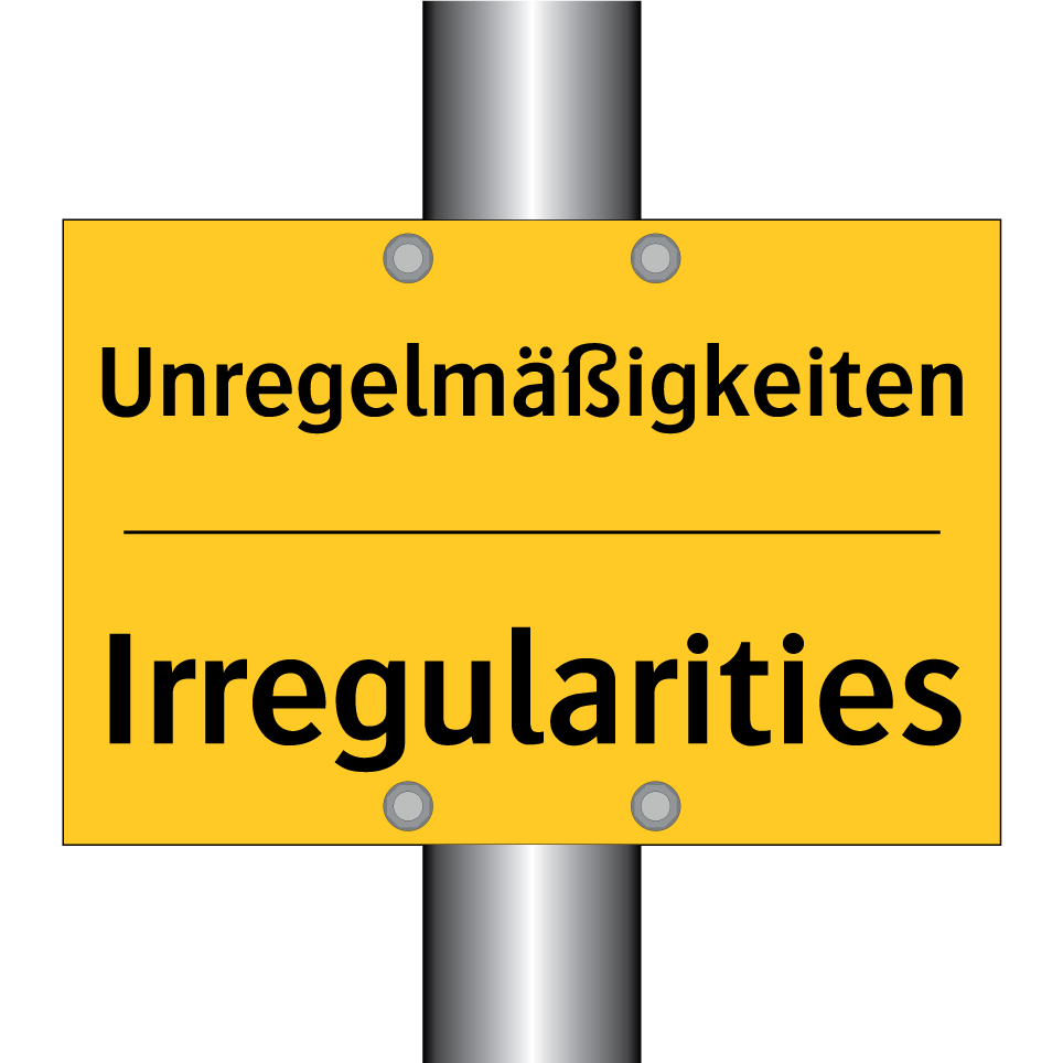 Zweisprachiges Warnschild mit deutschem Text Unregelmäßigkeiten und englischem Text Irregularities