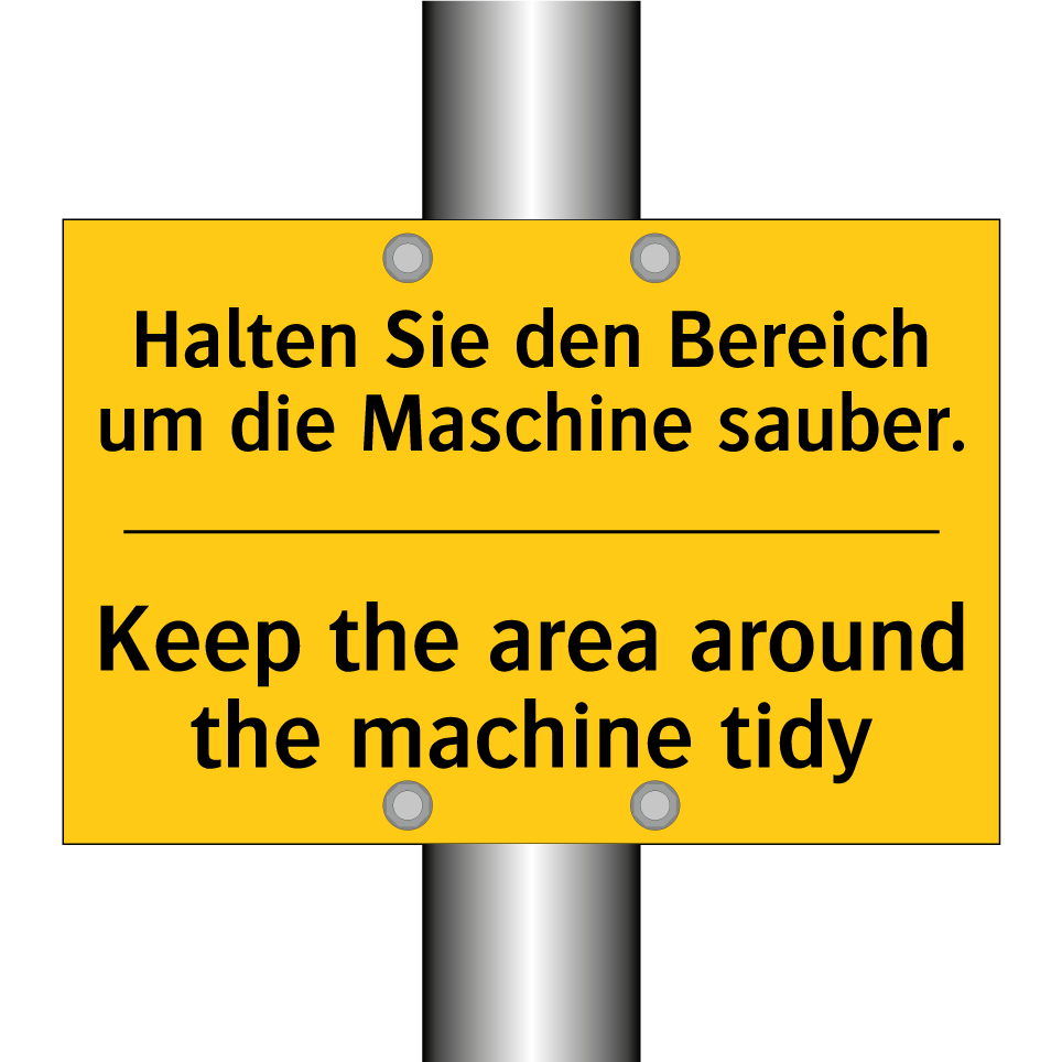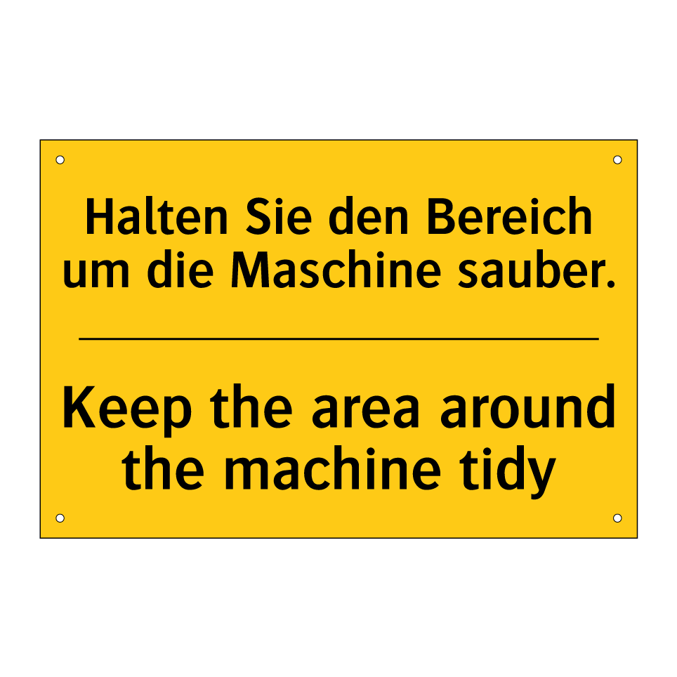 Zweisprachiges Warnschild mit deutschem Text Halten Sie den Bereich um die Maschine sauber. und englischem Text Keep the area around the machine tidy