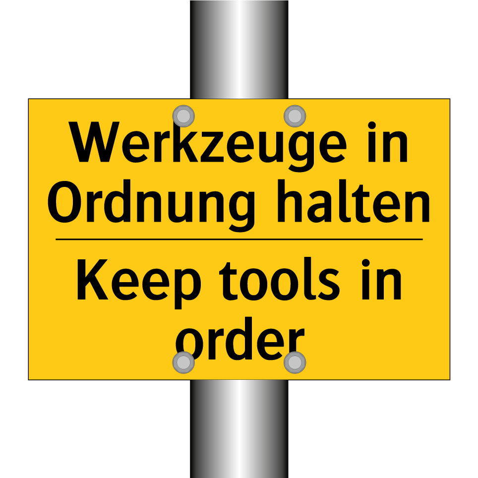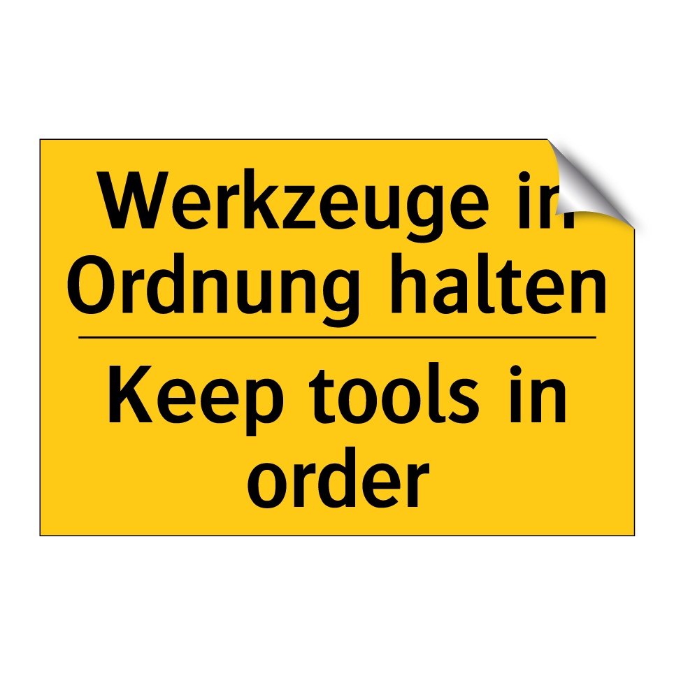 Zweisprachiges Warnschild mit deutschem Text Werkzeuge in Ordnung halten und englischem Text Keep tools in order