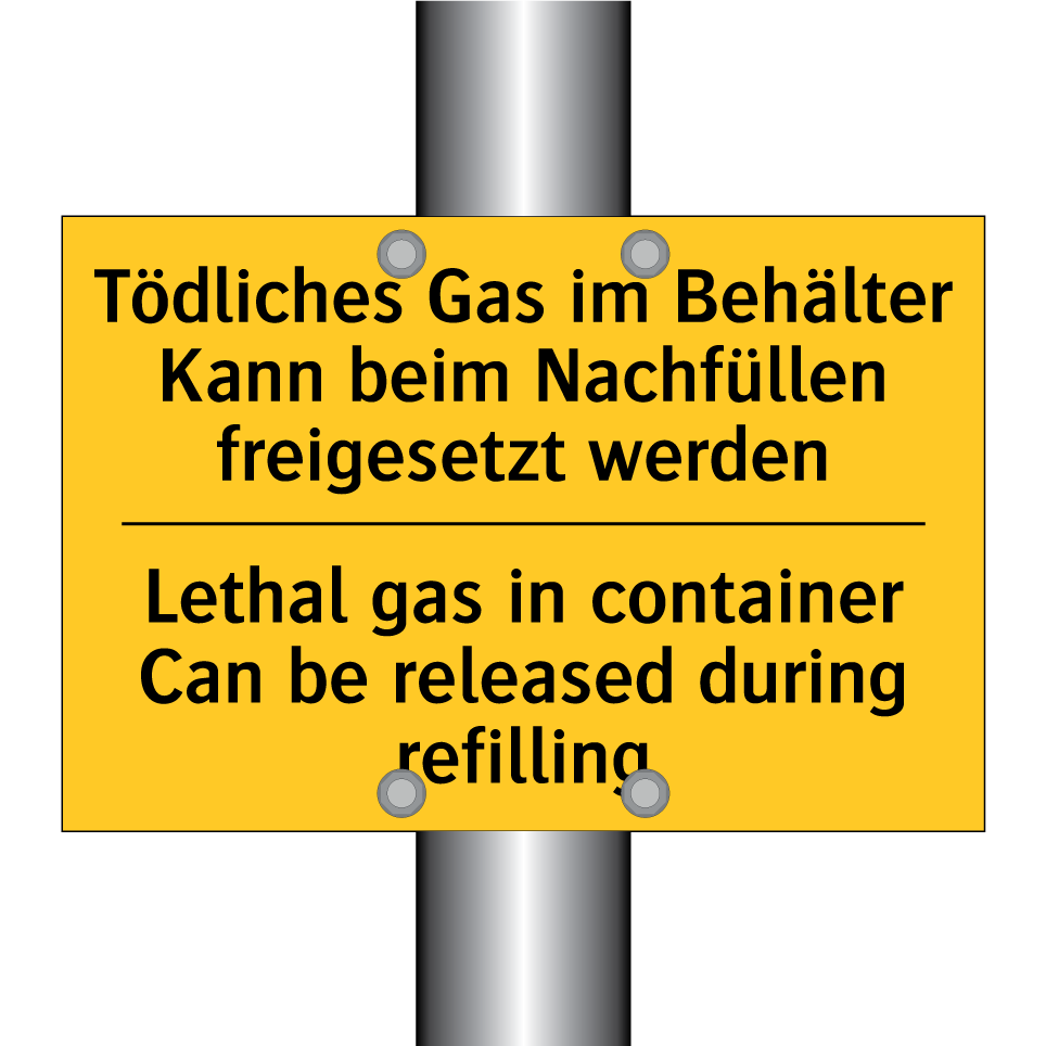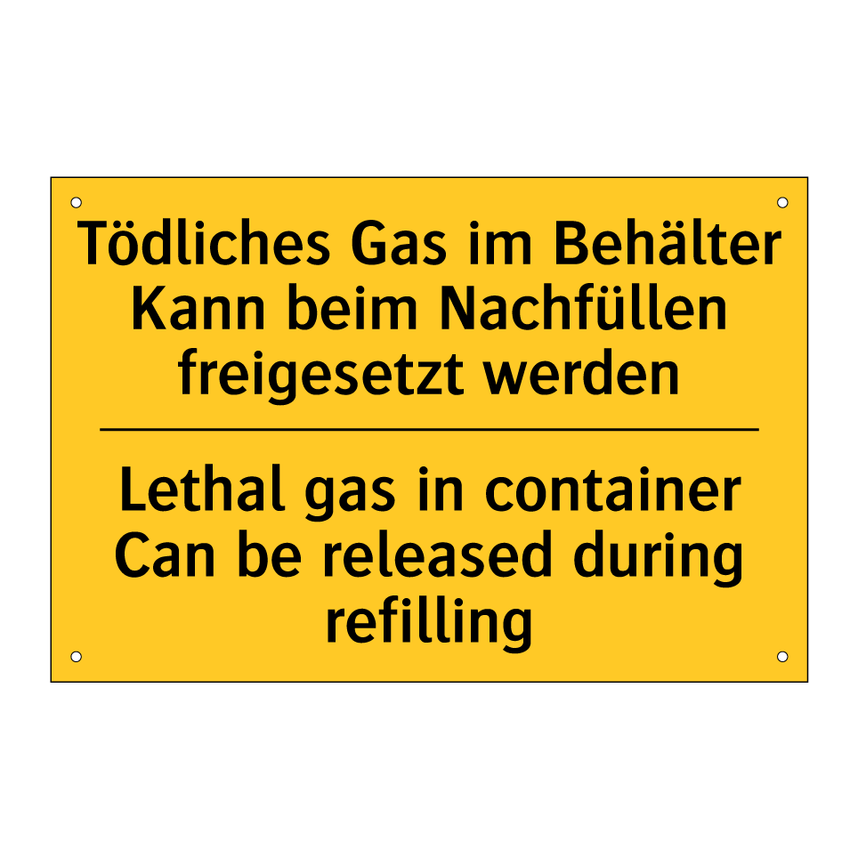 Zweisprachiges Warnschild mit deutschem Text Tödliches Gas im Behälter Kann beim Nachfüllen freigesetzt werden und englischem Text Lethal gas in container Can be released during refilling