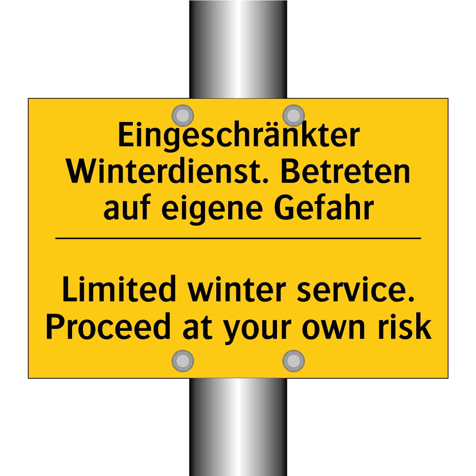 Zweisprachiges Warnschild mit deutschem Text Eingeschränkter Winterdienst. Betreten auf eigene Gefahr und englischem Text Limited winter service. Proceed at your own risk