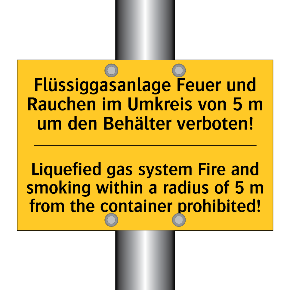 Zweisprachiges Warnschild mit deutschem Text Flüssiggasanlage Feuer und Rauchen im Umkreis von 5 m um den Behälter verboten! und englischem Text Liquefied gas system Fire and smoking within a radius of 5 m from the container prohibited!