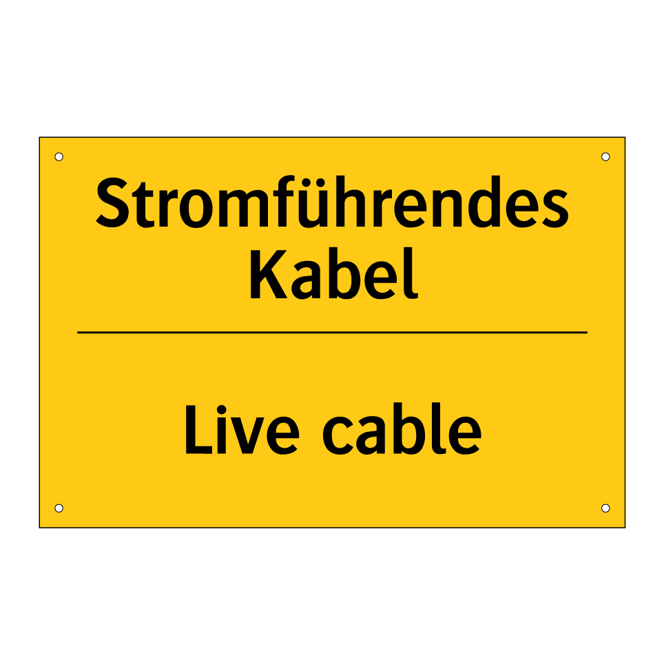 Zweisprachiges Warnschild mit deutschem Text Stromführendes Kabel und englischem Text Live cable