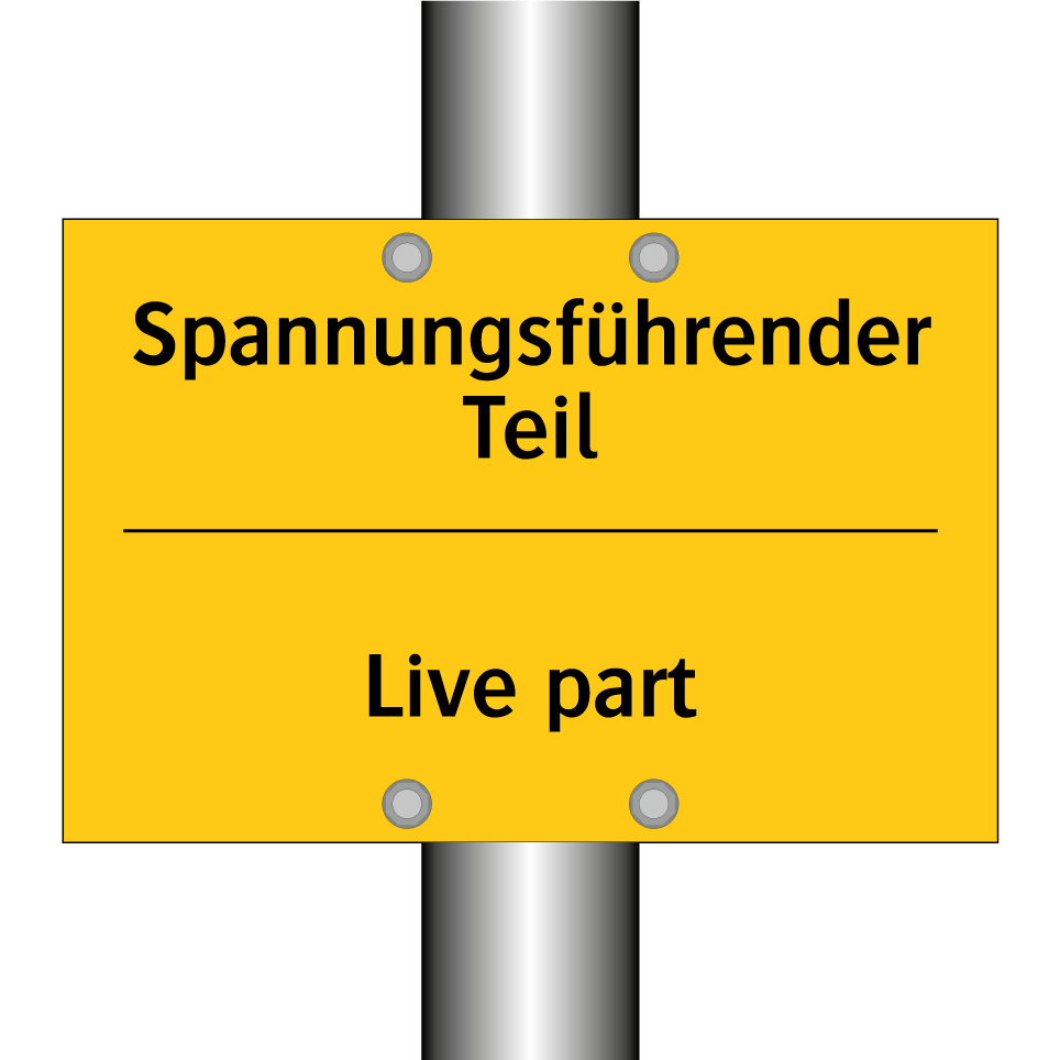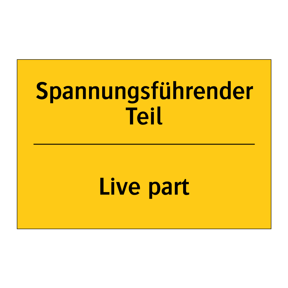 Zweisprachiges Warnschild mit deutschem Text Spannungsführender Teil und englischem Text Live part