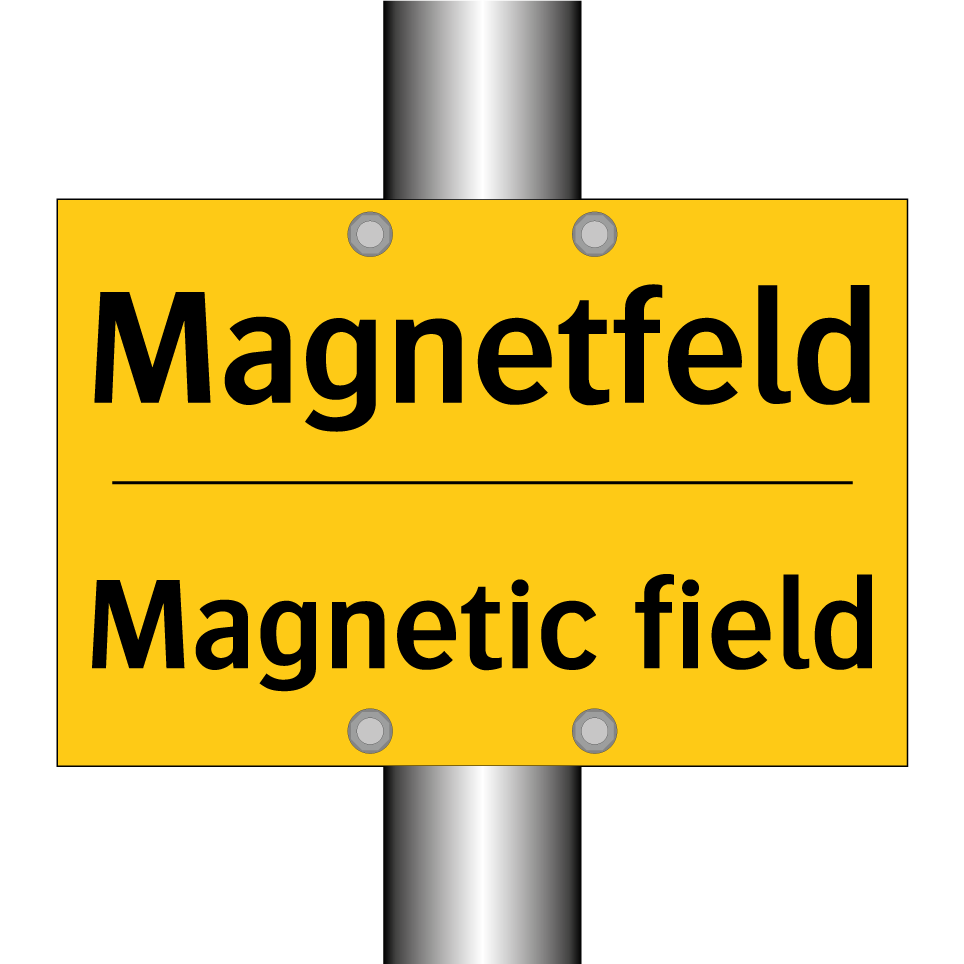 Zweisprachiges Warnschild mit deutschem Text Magnetfeld und englischem Text Magnetic field