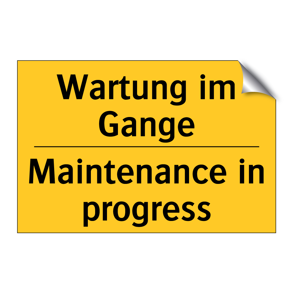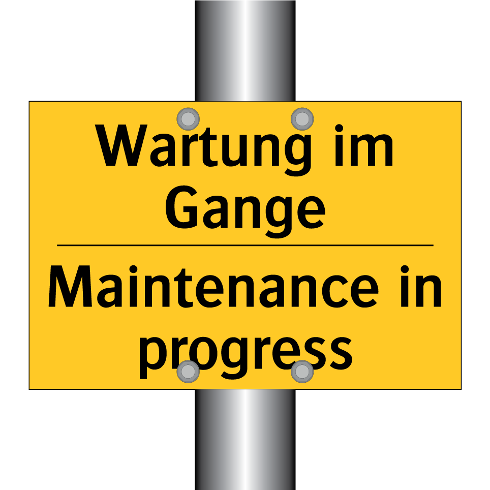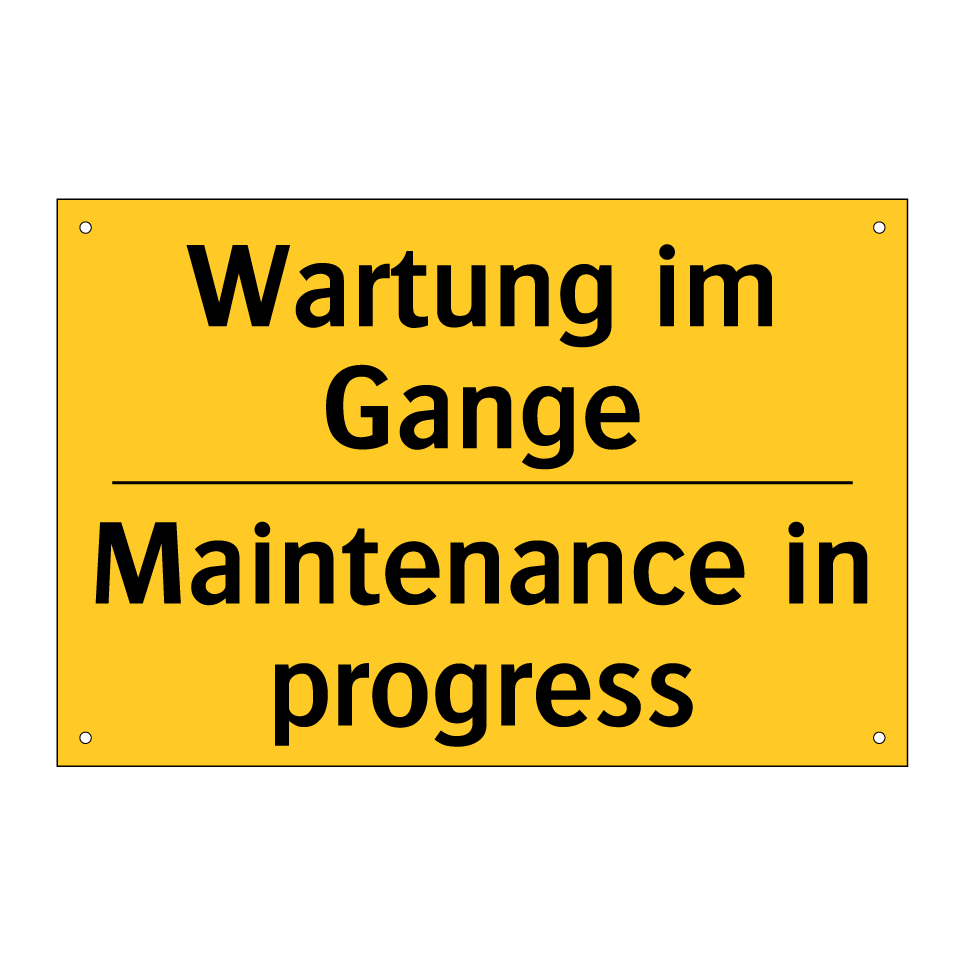 Zweisprachiges Warnschild mit deutschem Text Wartung im Gange und englischem Text Maintenance in progress
