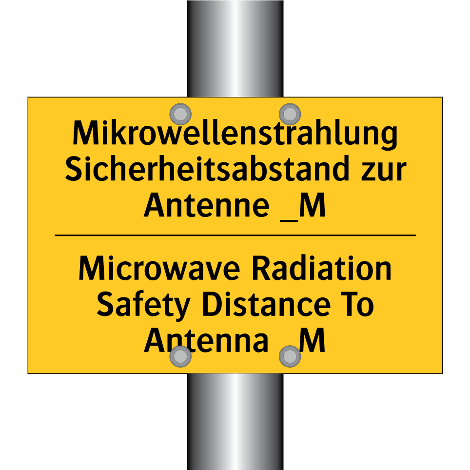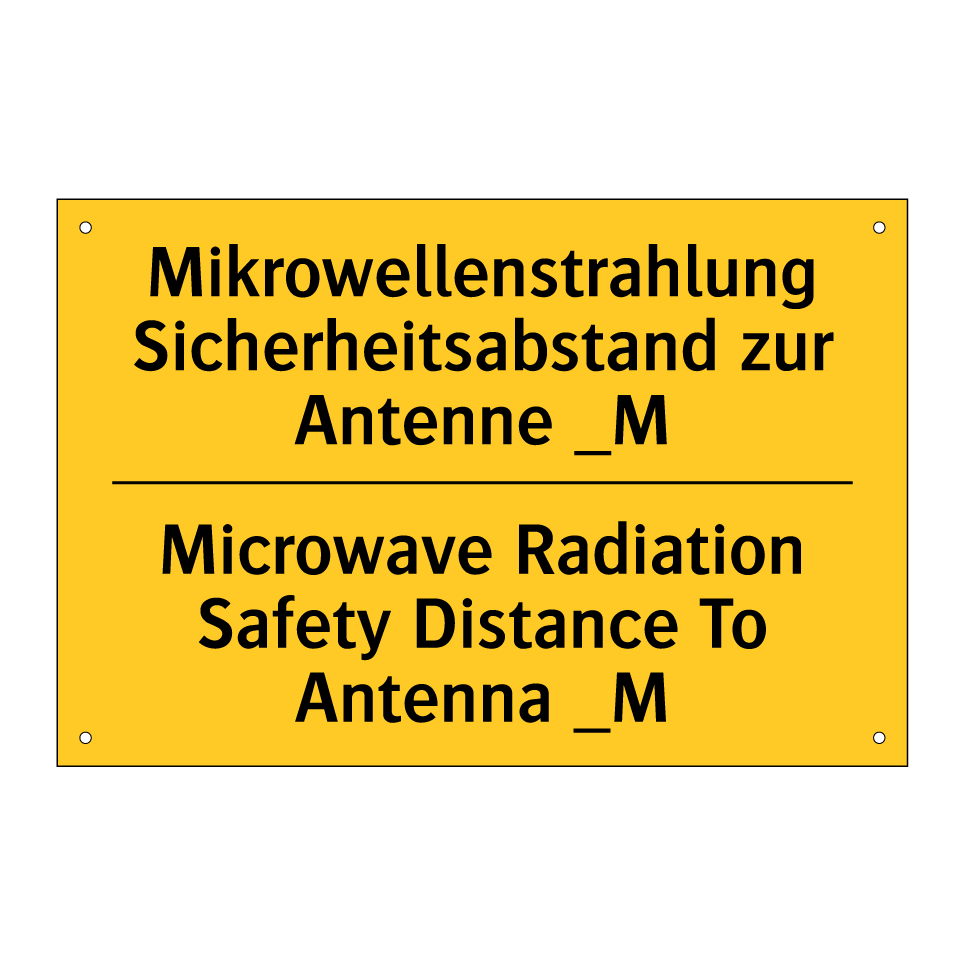 Zweisprachiges Warnschild mit deutschem Text Mikrowellenstrahlung Sicherheitsabstand zur Antenne _M und englischem Text Microwave Radiation Safety Distance To Antenna _M
