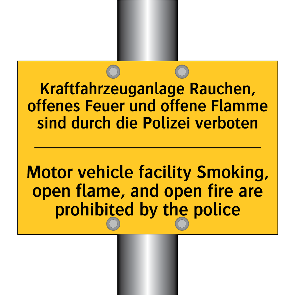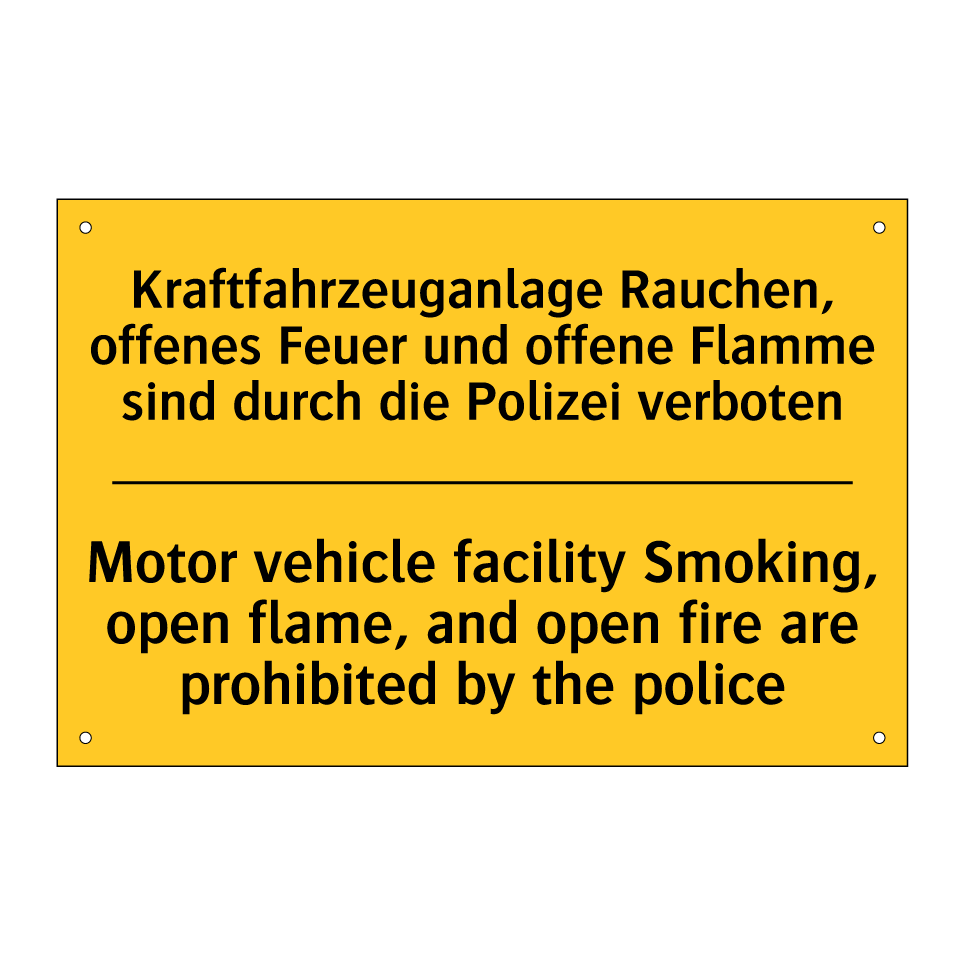 Zweisprachiges Warnschild mit deutschem Text Kraftfahrzeuganlage Rauchen, offenes Feuer und offene Flamme sind durch die Polizei verboten und englischem Text Motor vehicle facility Smoking, open flame, and open fire are prohibited by the police