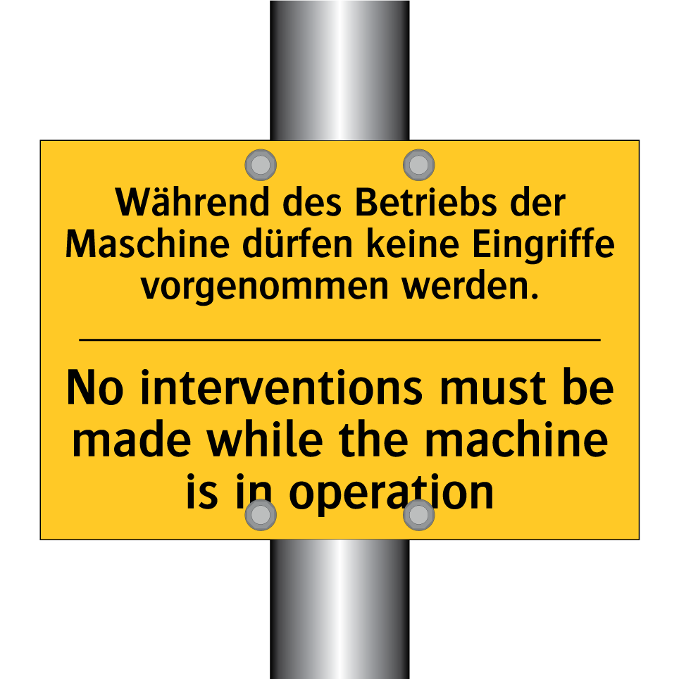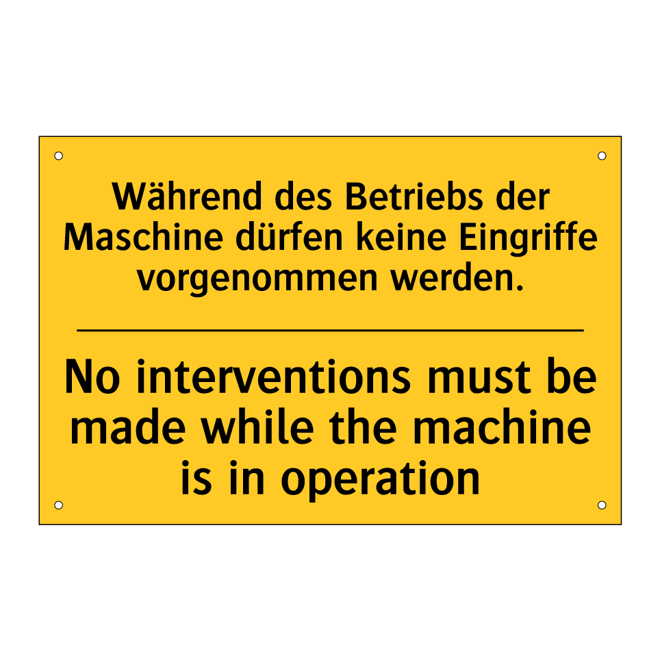 Zweisprachiges Warnschild mit deutschem Text Während des Betriebs der Maschine dürfen keine Eingriffe vorgenommen werden. und englischem Text No interventions must be made while the machine is in operation