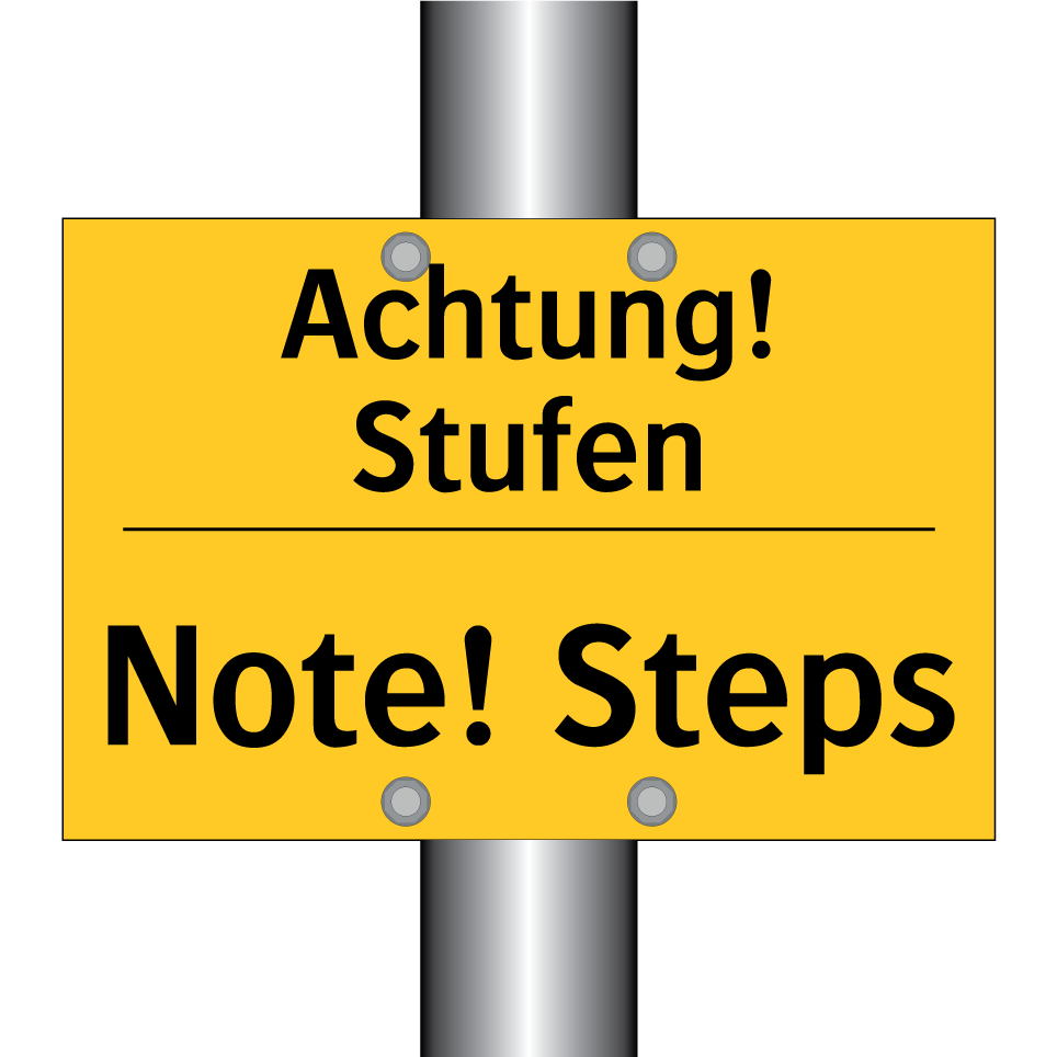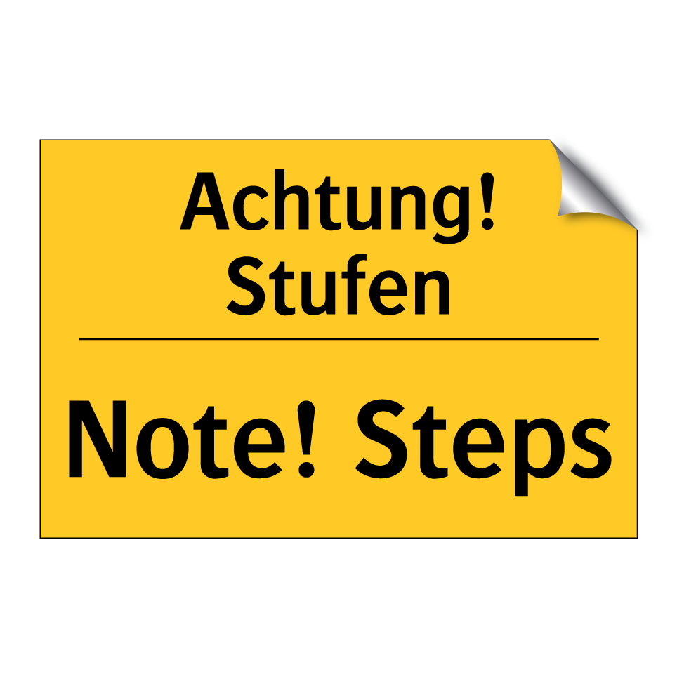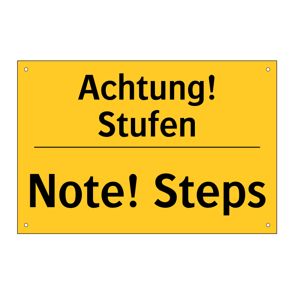 Zweisprachiges Warnschild mit deutschem Text Achtung! Stufen und englischem Text Note! Steps
