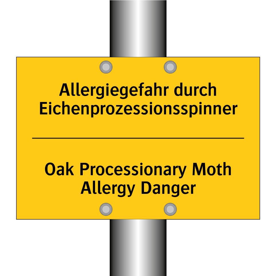 Zweisprachiges Warnschild mit deutschem Text Allergiegefahr durch Eichenprozessionsspinner und englischem Text Oak Processionary Moth Allergy Danger