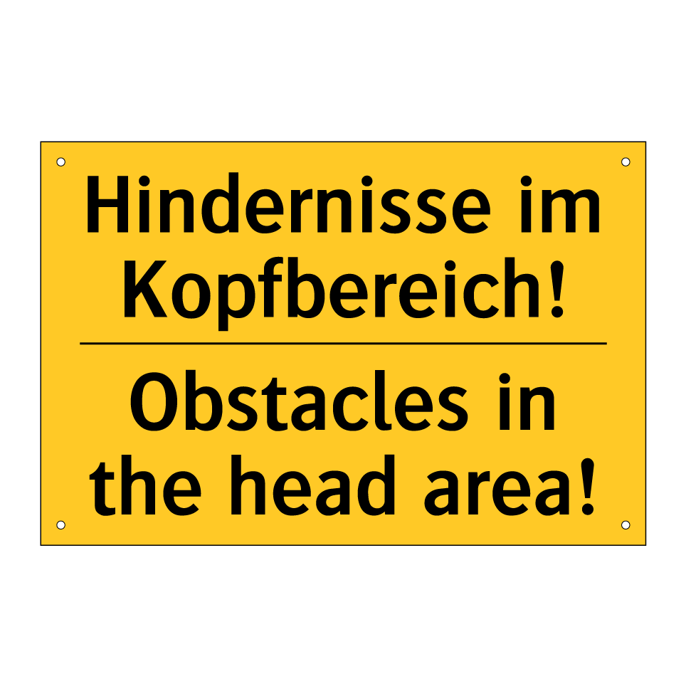 Zweisprachiges Warnschild mit deutschem Text Hindernisse im Kopfbereich! und englischem Text Obstacles in the head area!
